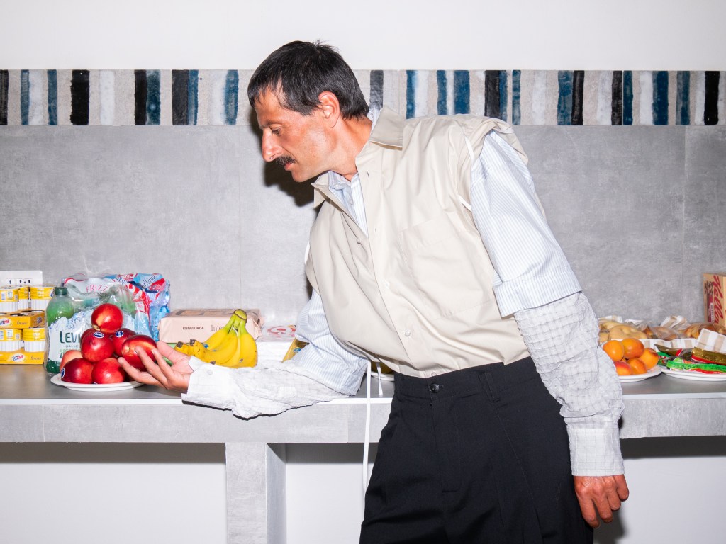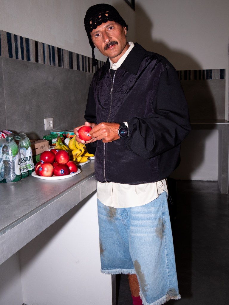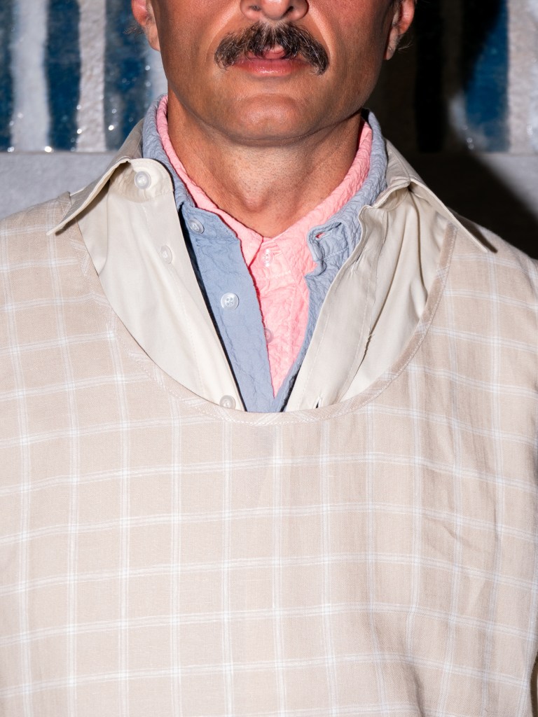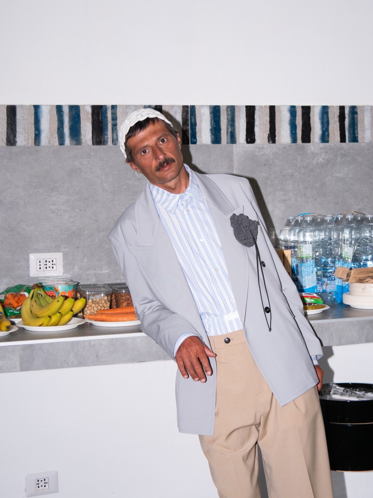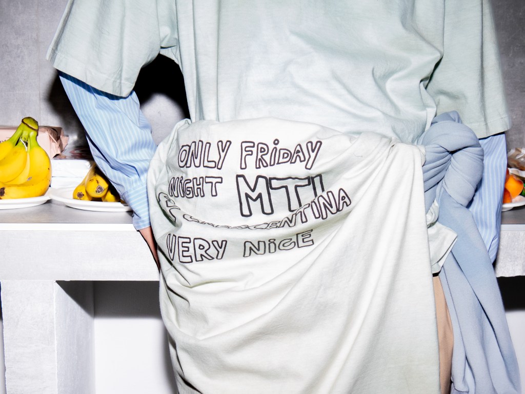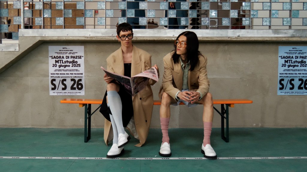 Rather than opting for a traditional runway, MTL Studio embraced a playful, community-inspired presentation. The venue was decorated to mimic the atmosphere of a small-town Italian festival with a table set for playing cards, benches around a makeshift ball court, and lively folk music blasting through the speaker.
