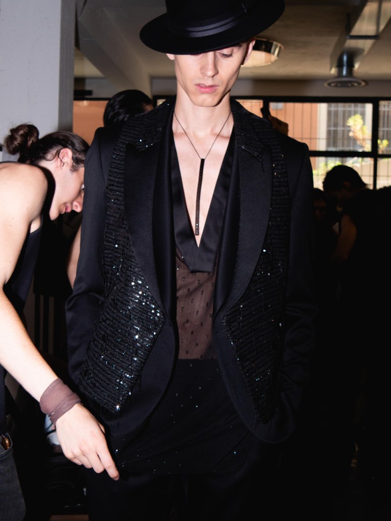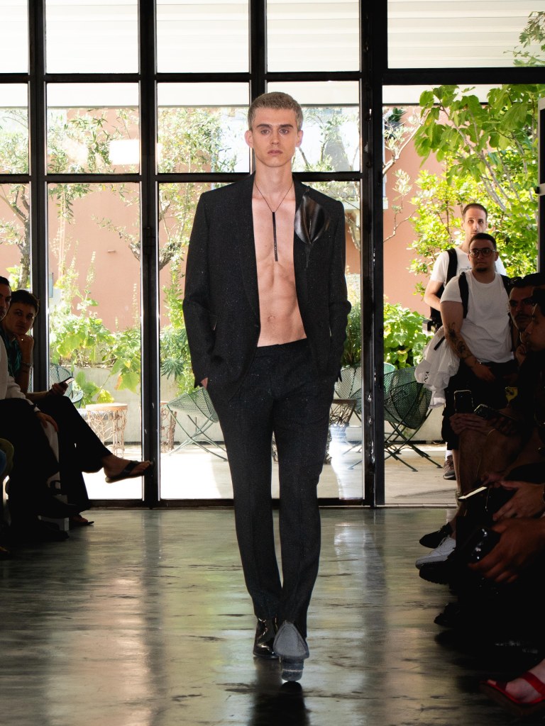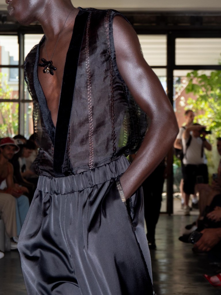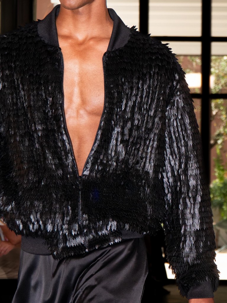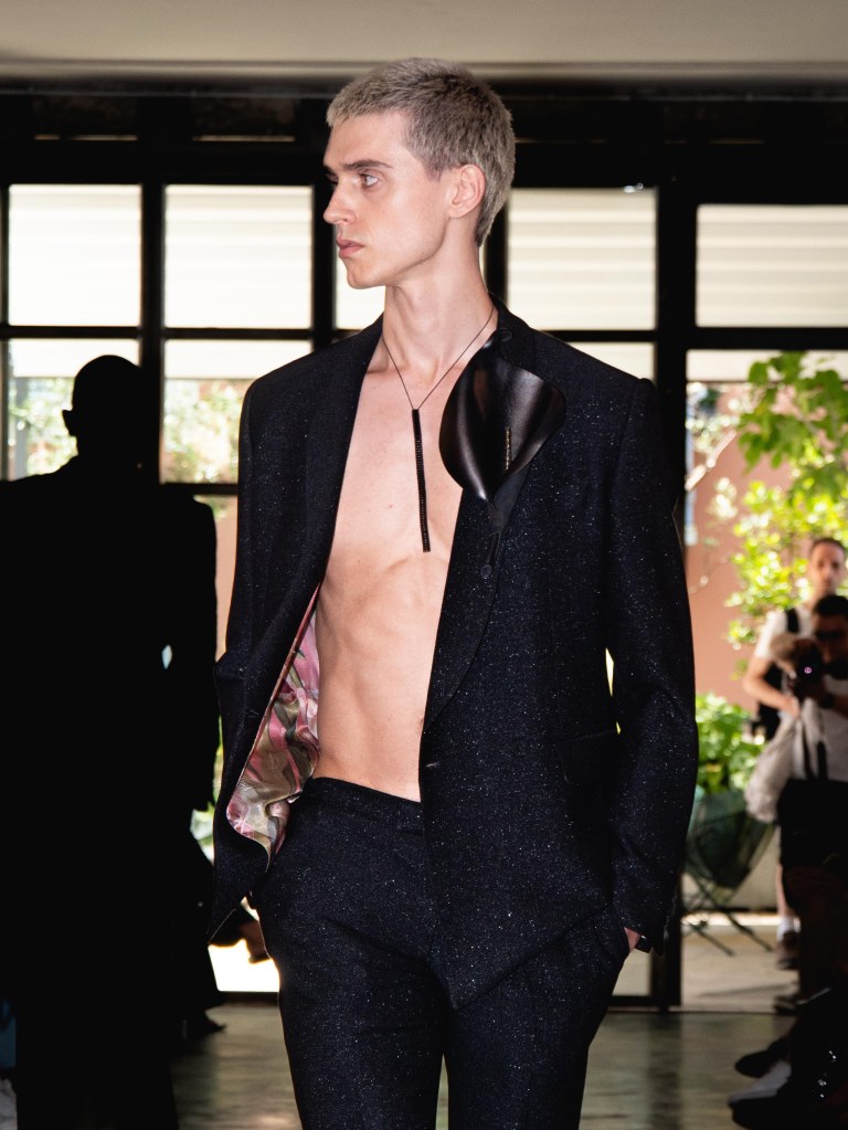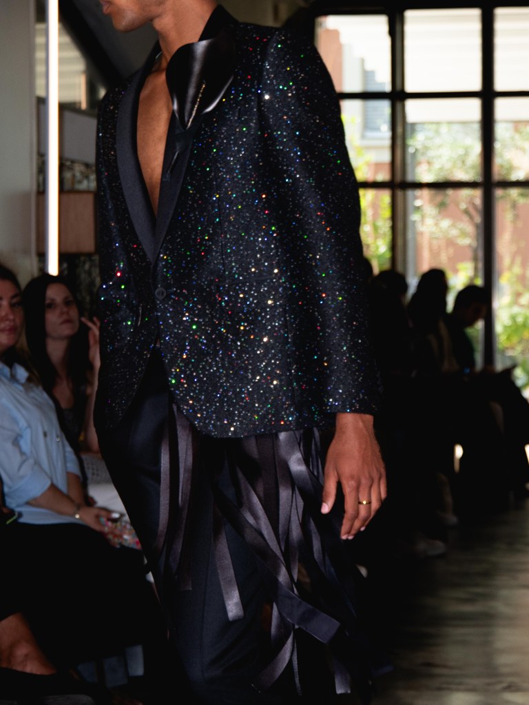 Although the collection leans towards minimal, Miguel Vieira plays with texture in a way that makes everything feel mysterious and sensual. There were paillettes and sequins catching the light, satin ribbons mimicking fringe on the dresses, tiny laser-cut leather, and tufted fabrics. As the models strut down the runway, I notice that the lining of some of the suits are actually colorful floral prints a detail that ties everything back to the “Night in the Garden” theme. It’s subtle, unexpected, and adds a kind of hidden softness to the otherwise sleek and moody looks. Nothing too loud or flashy, just textures and sharp tailoring and sensuality from the exposed torsos.