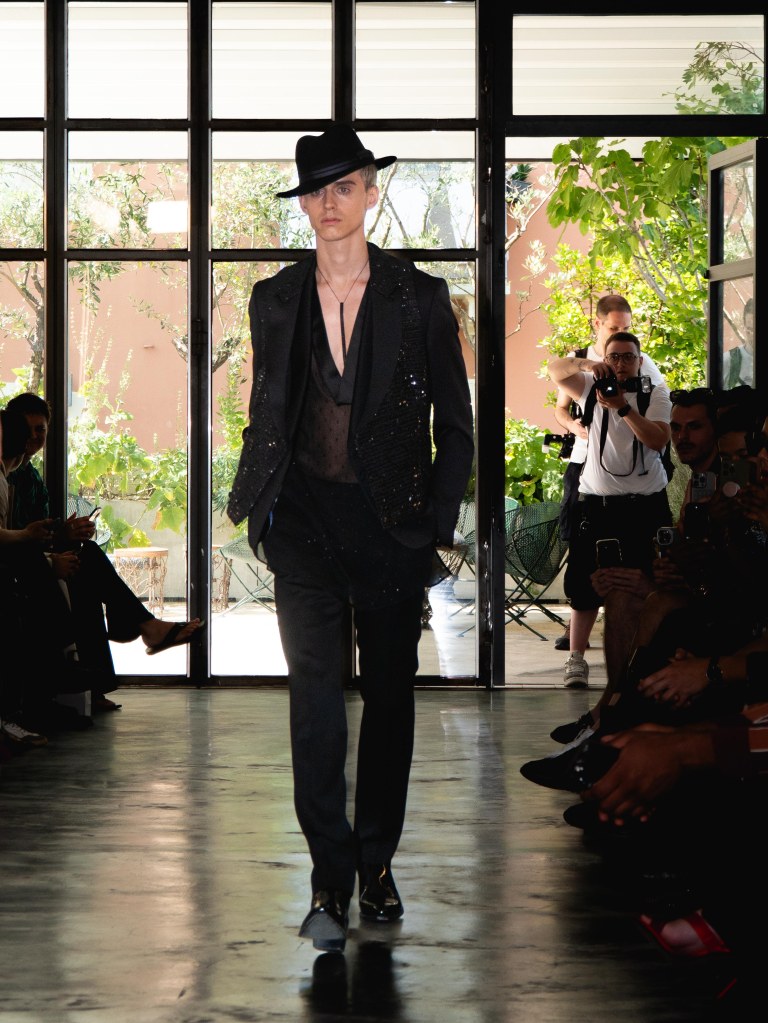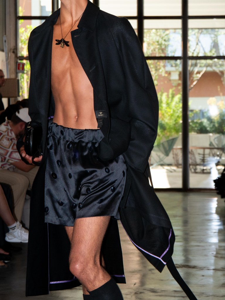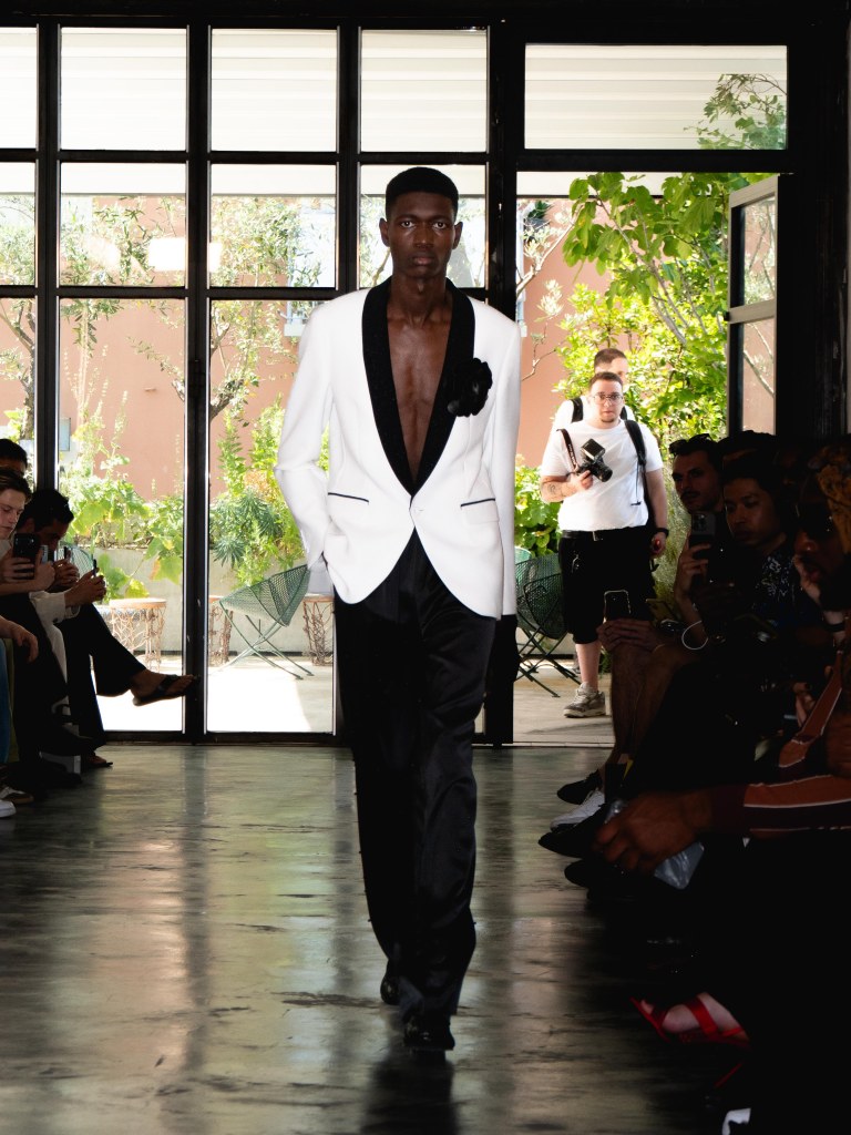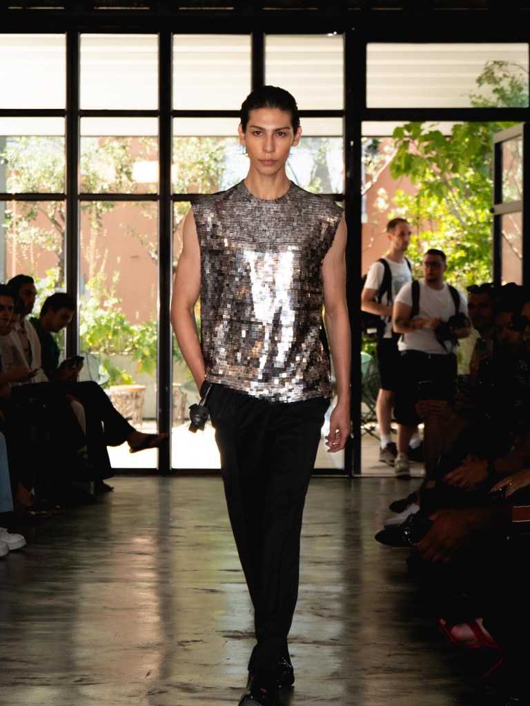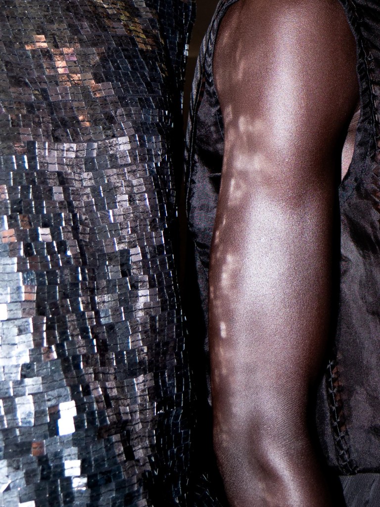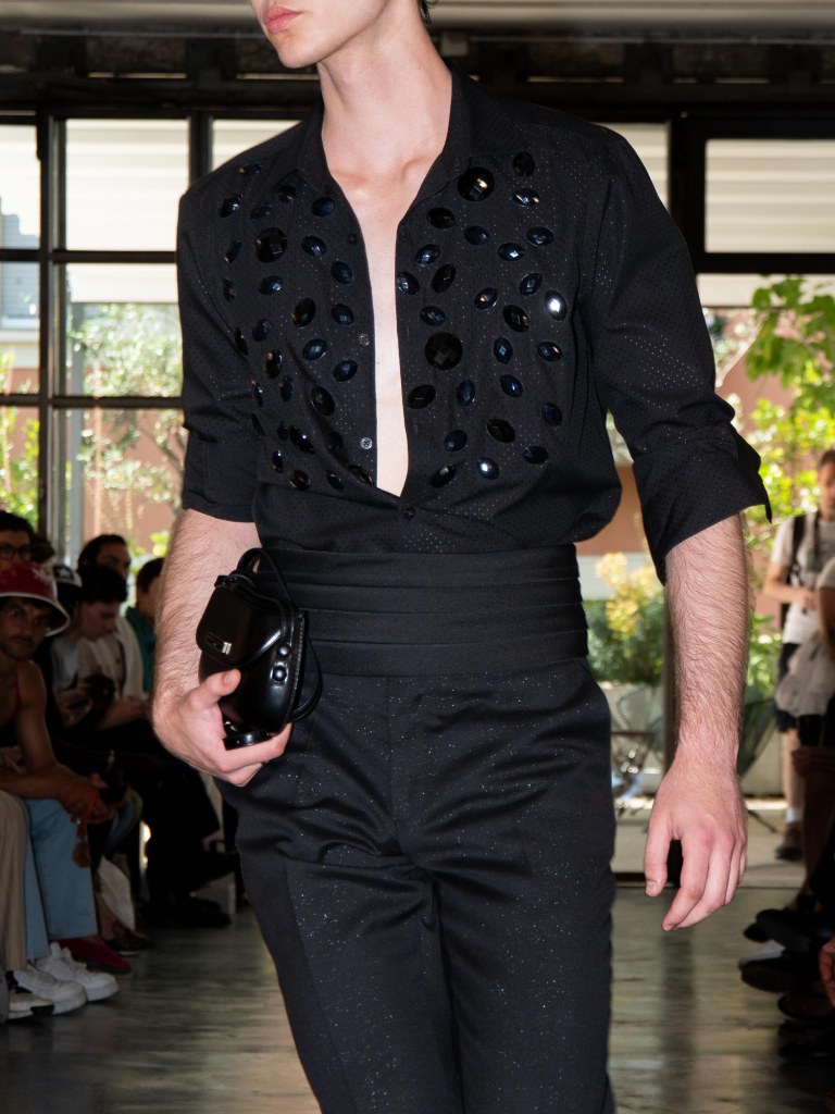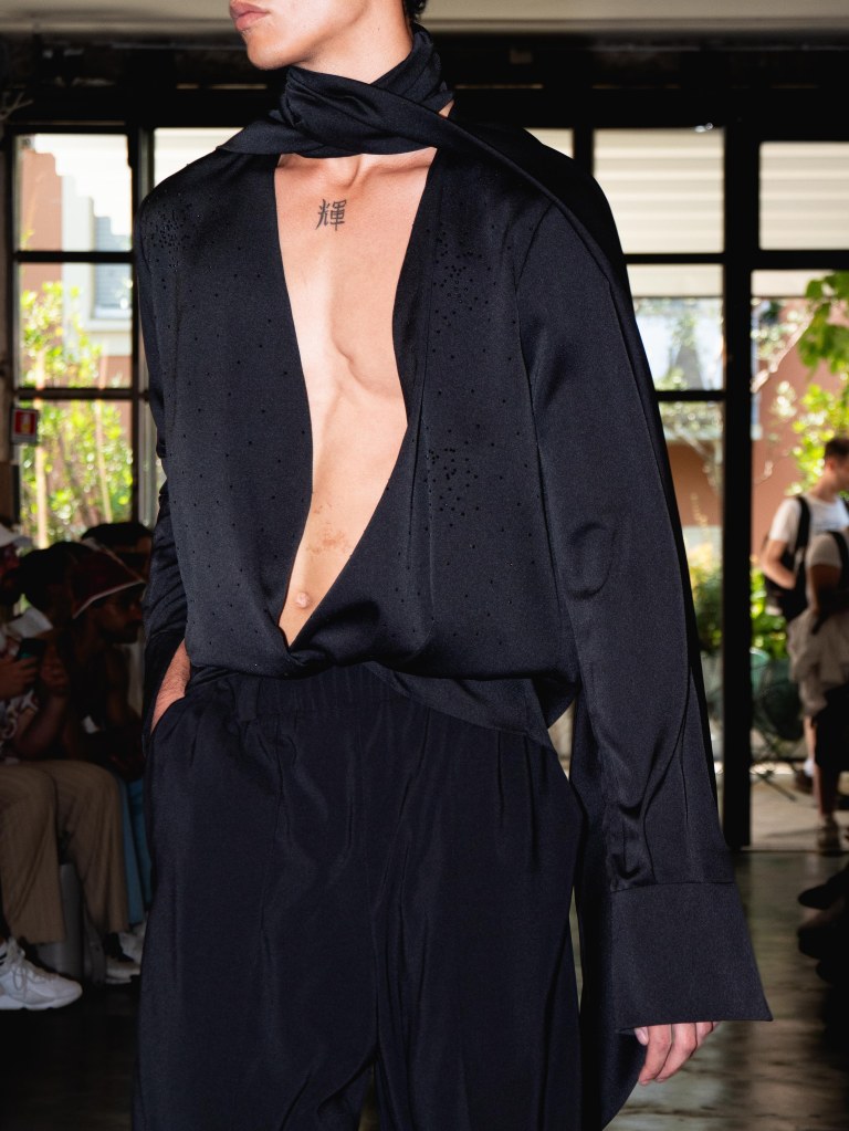 Although the collection leans towards minimal, Miguel Vieira plays with texture in a way that makes everything feel mysterious and sensual. There were paillettes and sequins catching the light, satin ribbons mimicking fringe on the dresses, tiny laser-cut leather, and tufted fabrics. As the models strut down the runway, I notice that the lining of some of the suits are actually colorful floral prints a detail that ties everything back to the “Night in the Garden” theme. It’s subtle, unexpected, and adds a kind of hidden softness to the otherwise sleek and moody looks. Nothing too loud or flashy, just textures and sharp tailoring and sensuality from the exposed torsos.