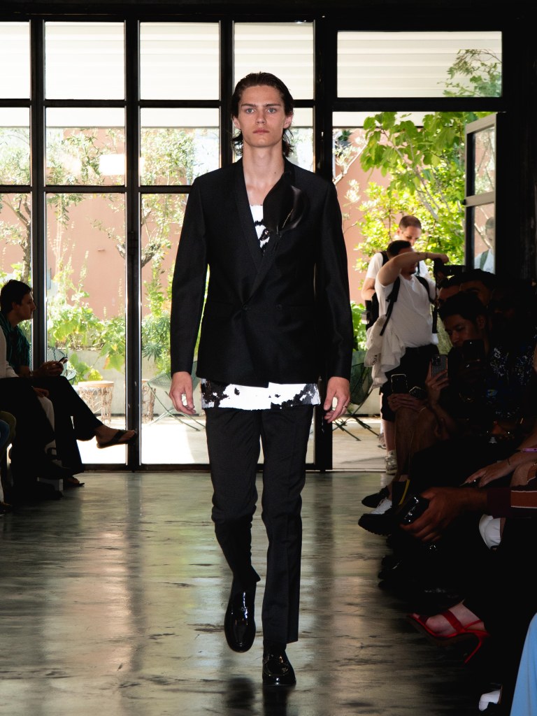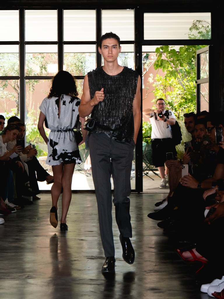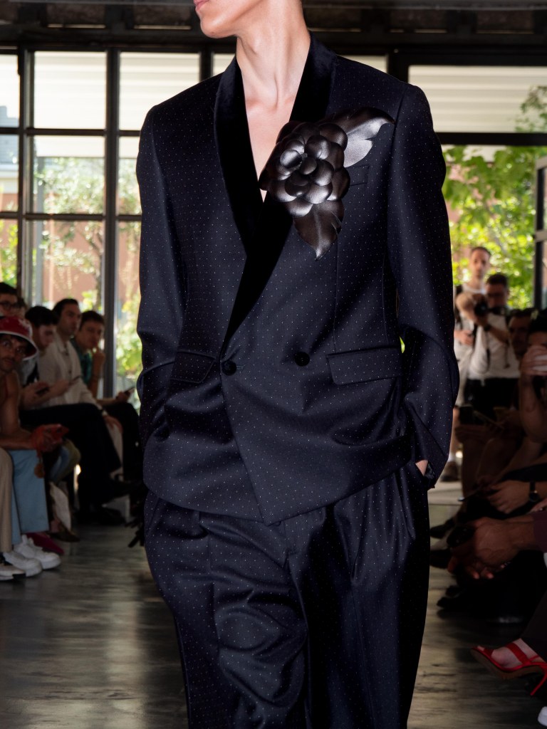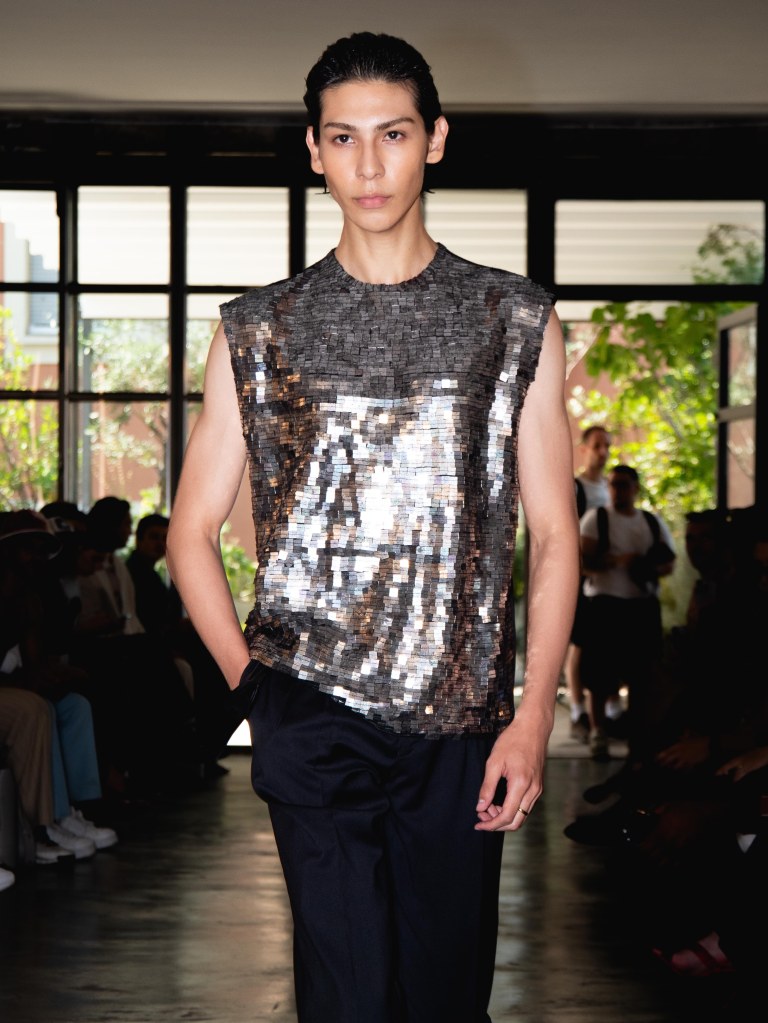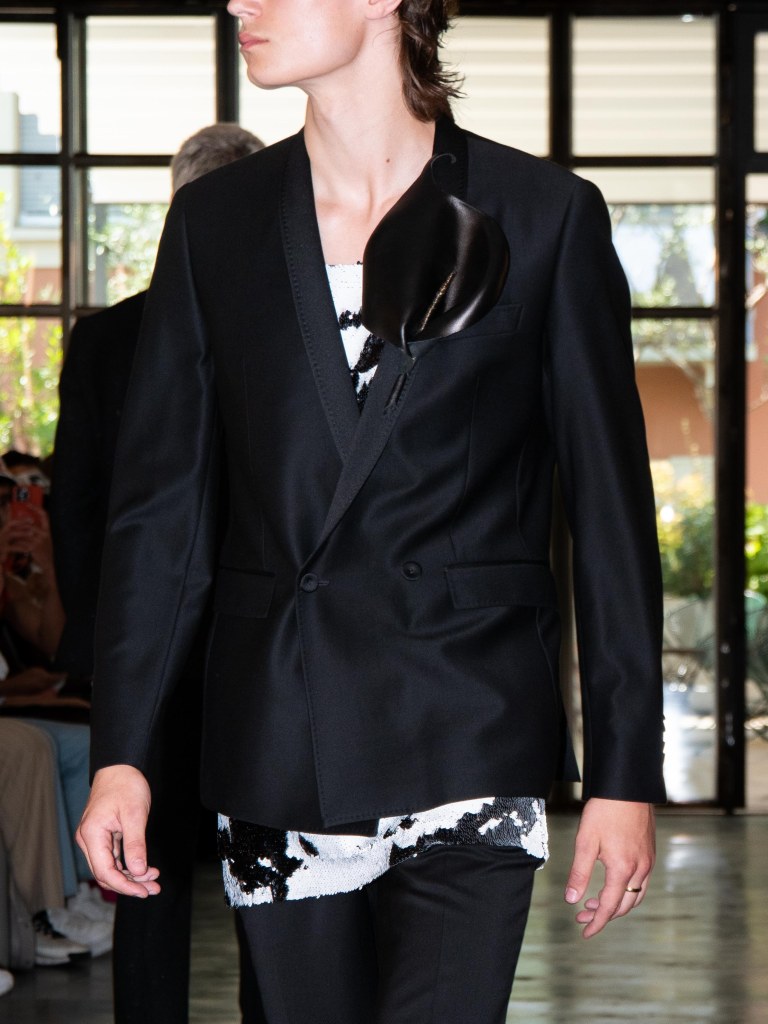 Among the runway models was the multi-talented Raul Murakami, who walked with a cool, effortless sophistication. He wore two looks: one was a silver sequin top paired with black trousers, and the other was a tufted jacket with a giant flower appliqué on the left chest, styled with a shiny pair of black trousers.