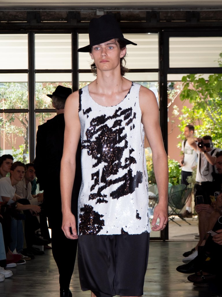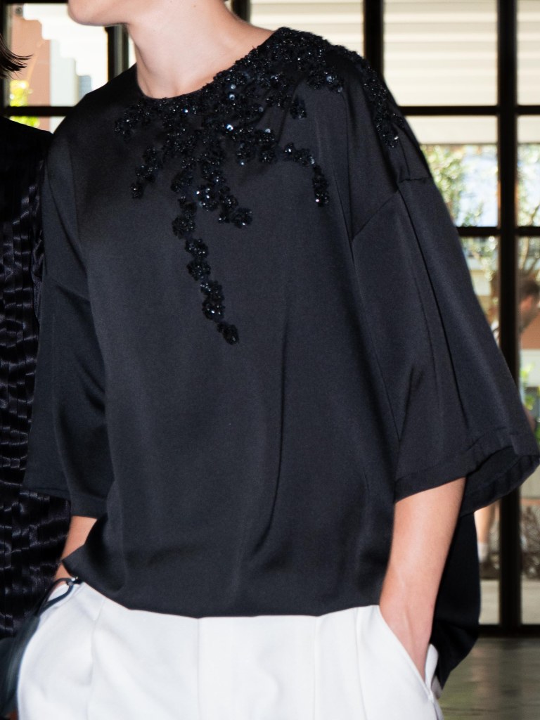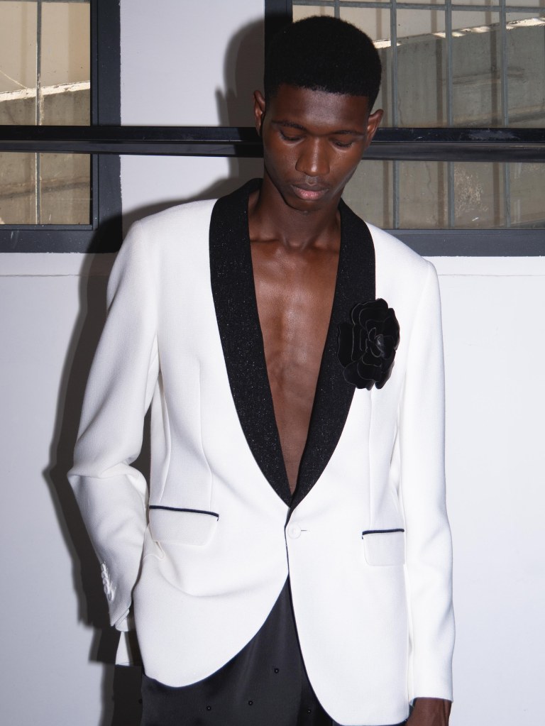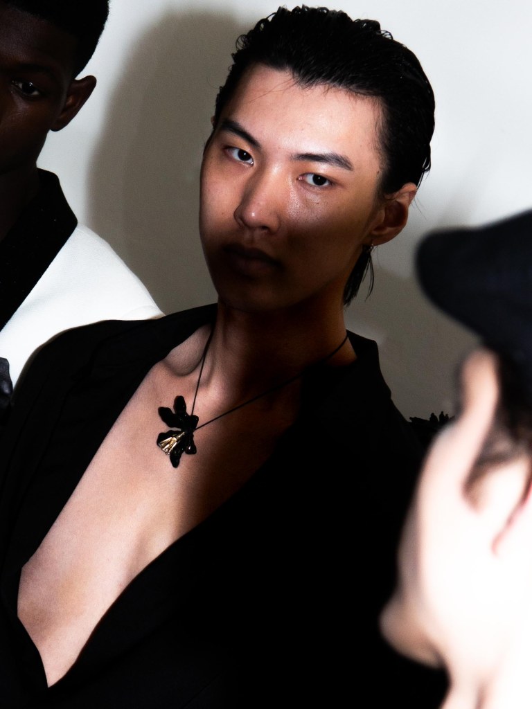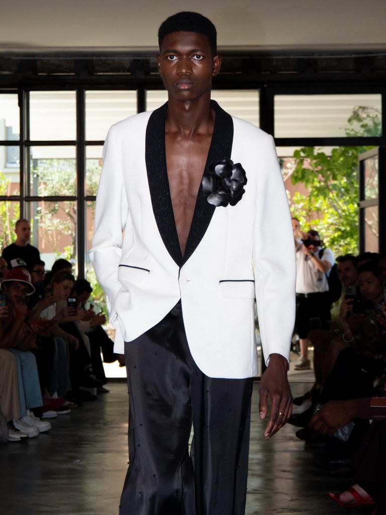 Among the runway models was the multi-talented Raul Murakami, who walked with a cool, effortless sophistication. He wore two looks: one was a silver sequin top paired with black trousers, and the other was a tufted jacket with a giant flower appliqué on the left chest, styled with a shiny pair of black trousers.