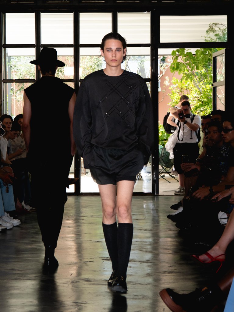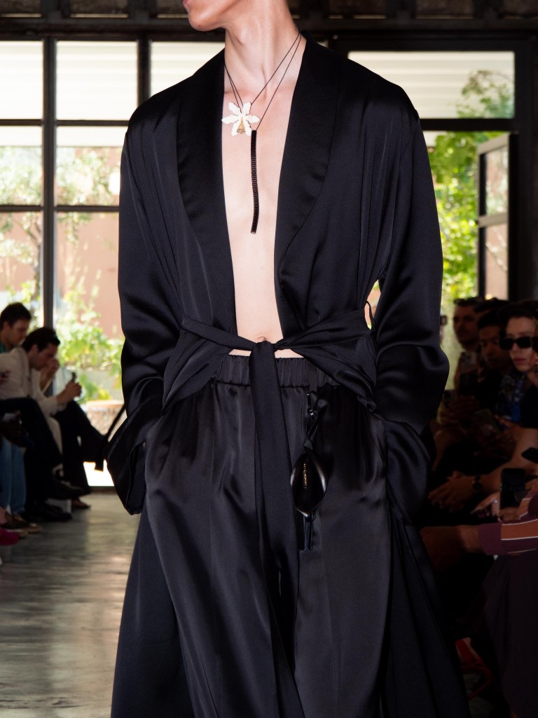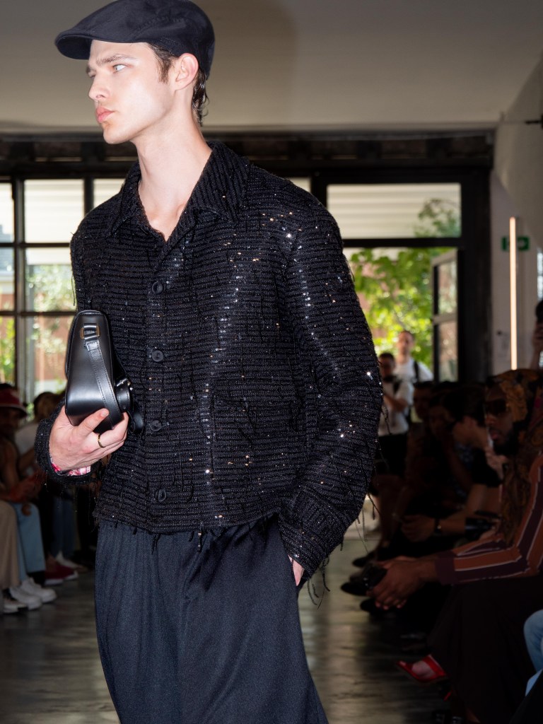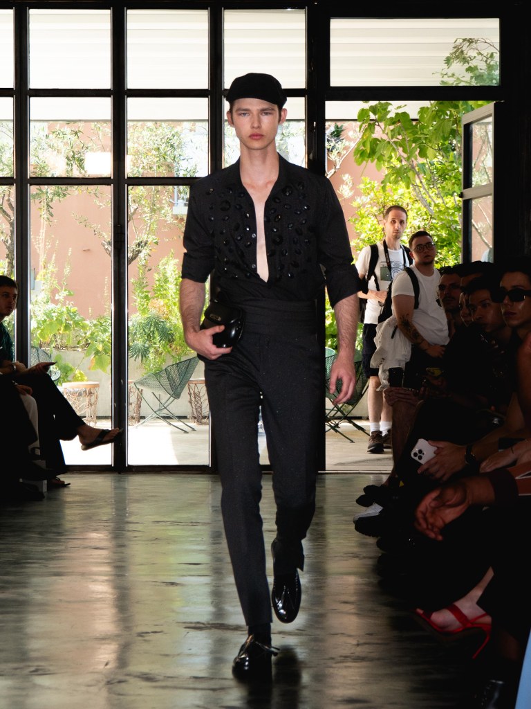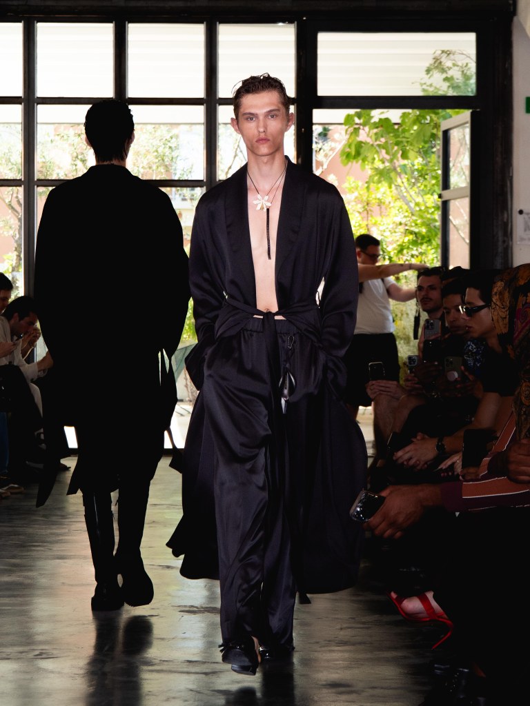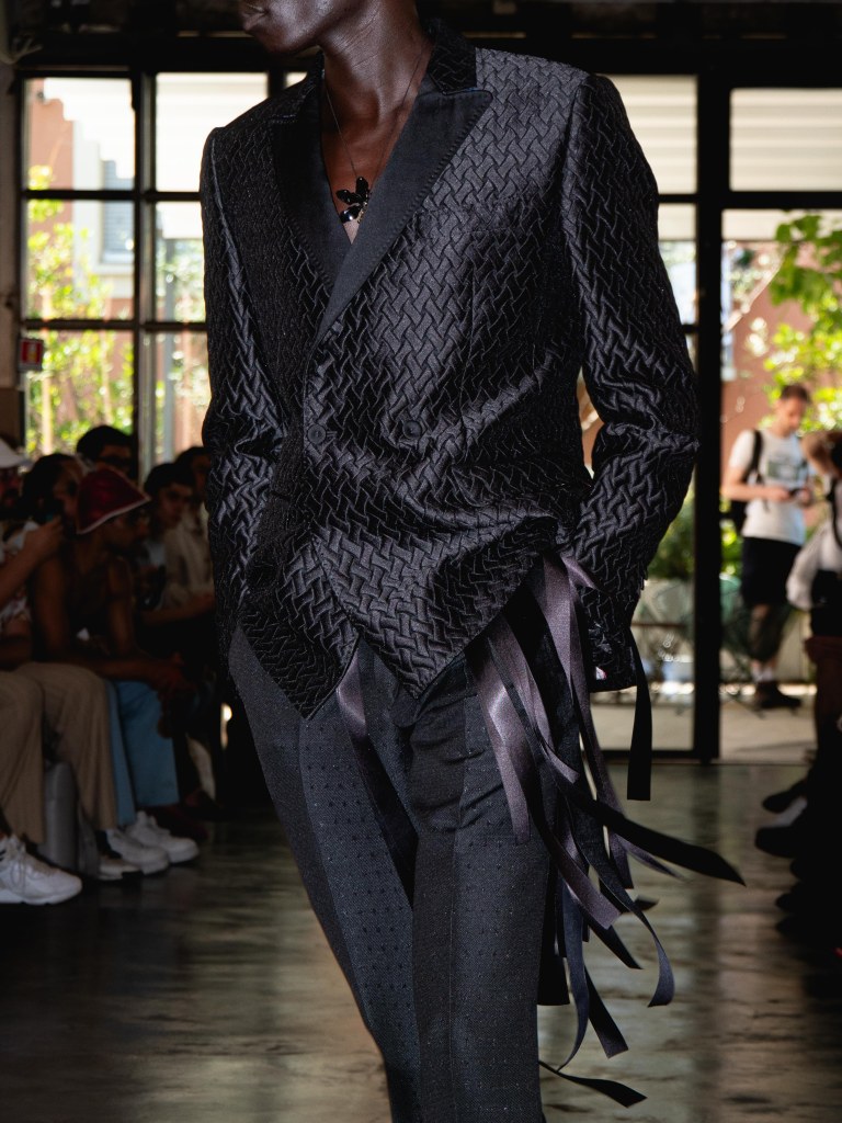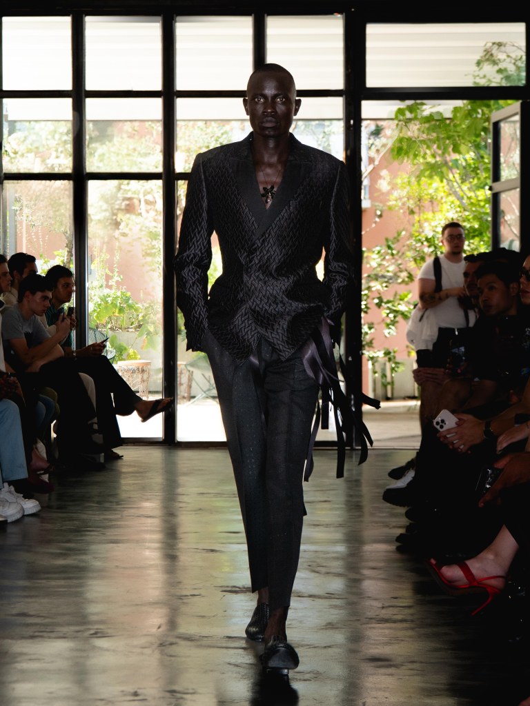 Miguel Vieira’s SS26 collection, A Night In The Garden, brought a sleek and moody energy to Milan Fashion Week. Dominated by black, the whole collection felt like an ode to the elegance of nighttime. There were floral details here and there, but everything stayed minimal, polished, and refined.