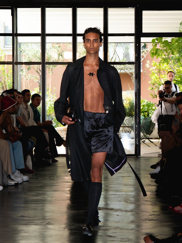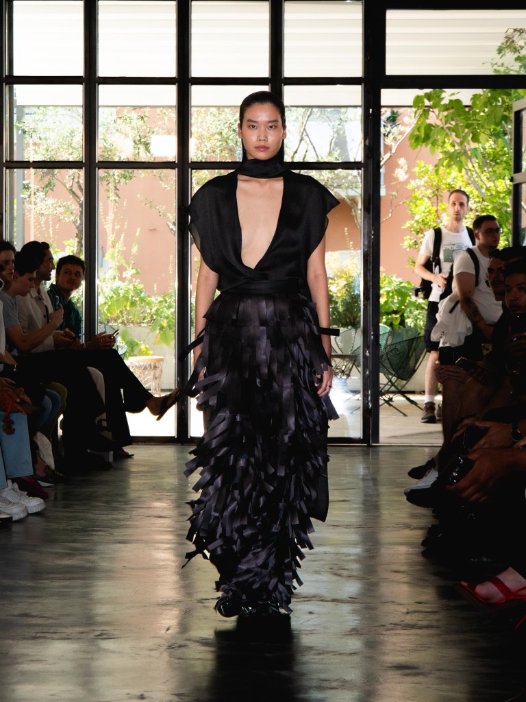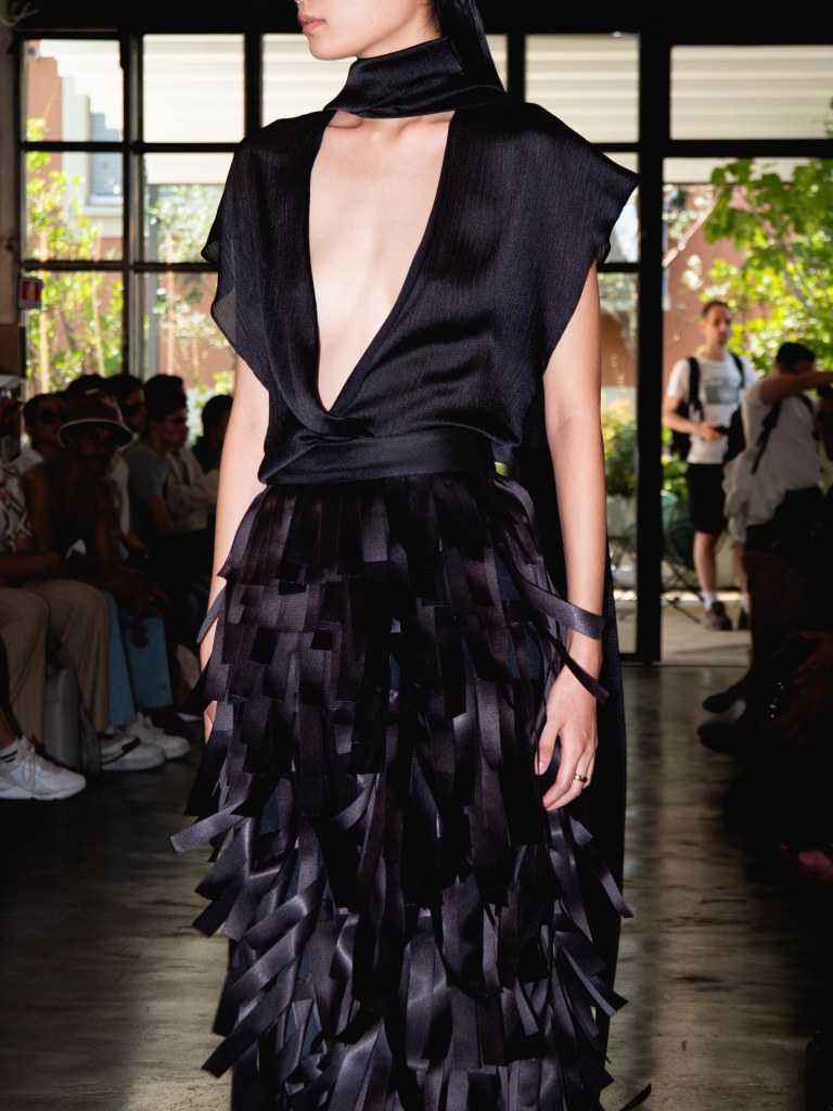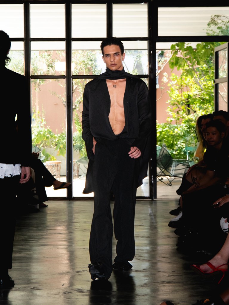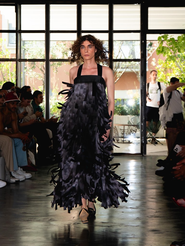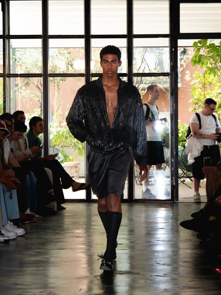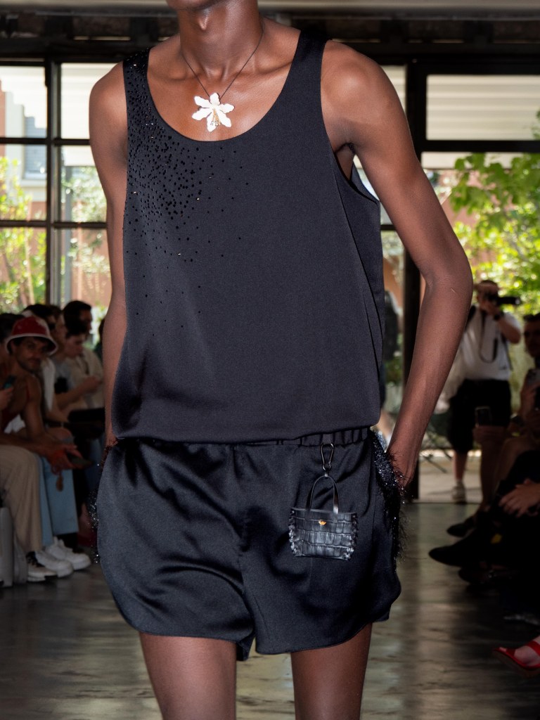 Miguel Vieira’s SS26 collection, A Night In The Garden, brought a sleek and moody energy to Milan Fashion Week. Dominated by black, the whole collection felt like an ode to the elegance of nighttime. There were floral details here and there, but everything stayed minimal, polished, and refined.