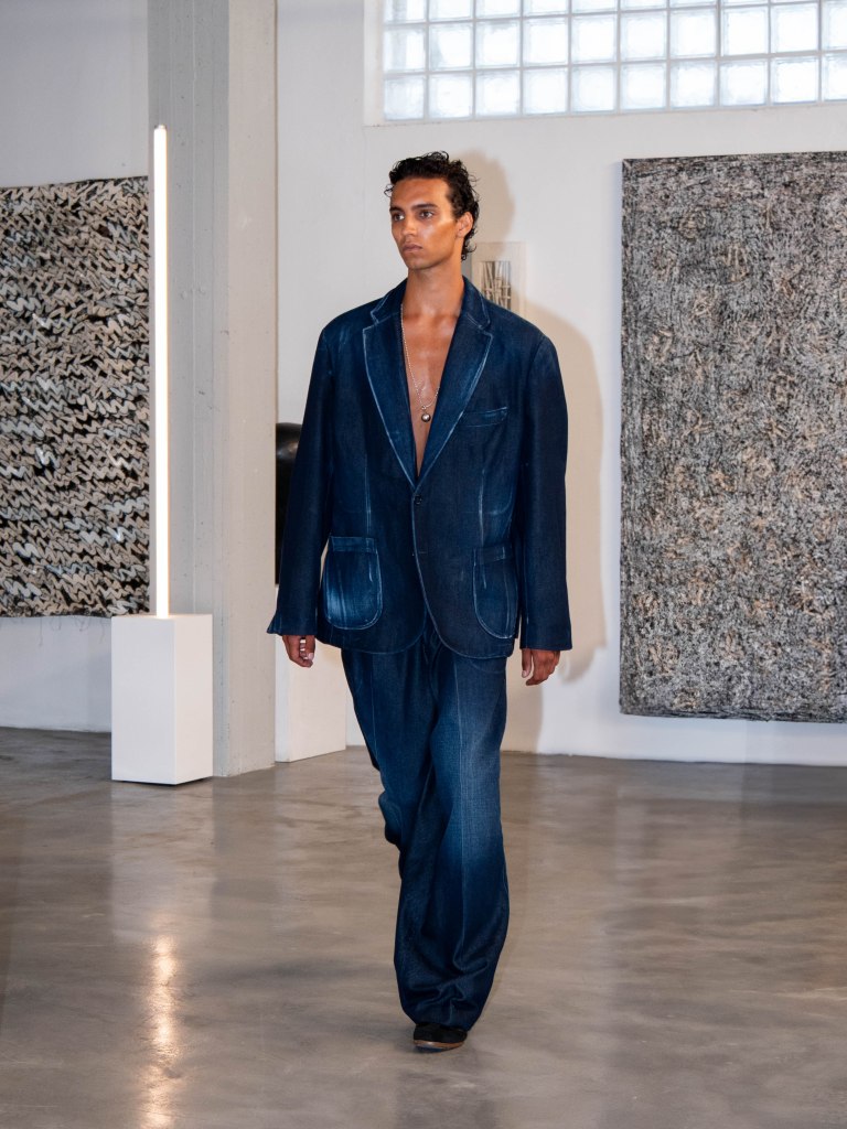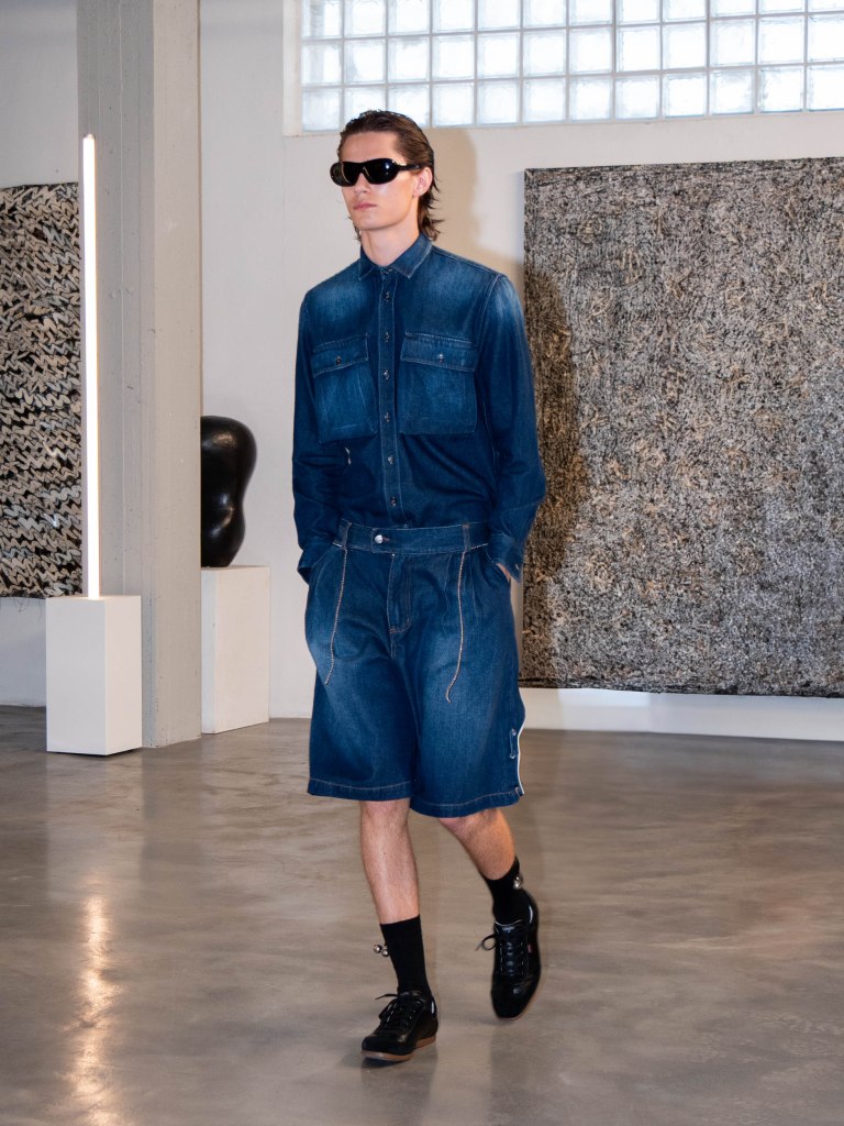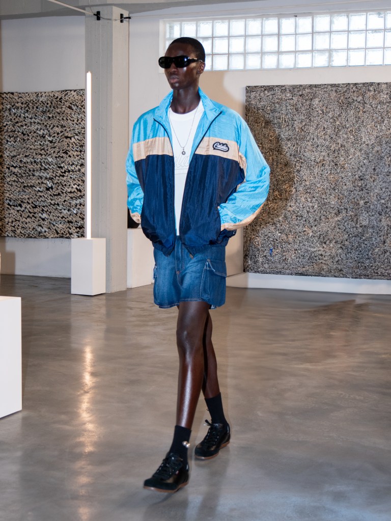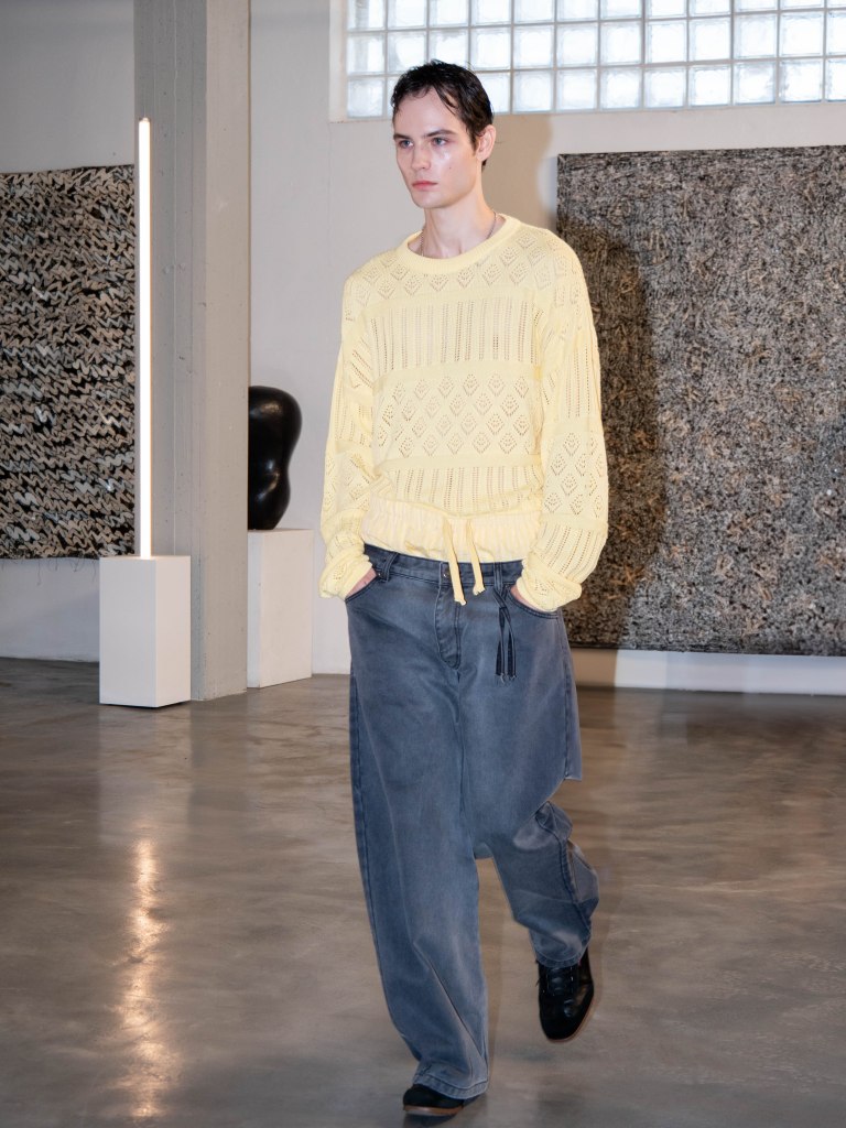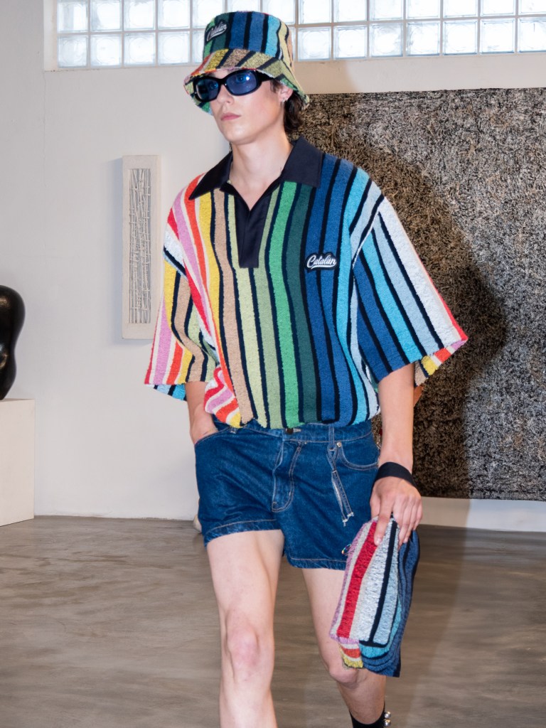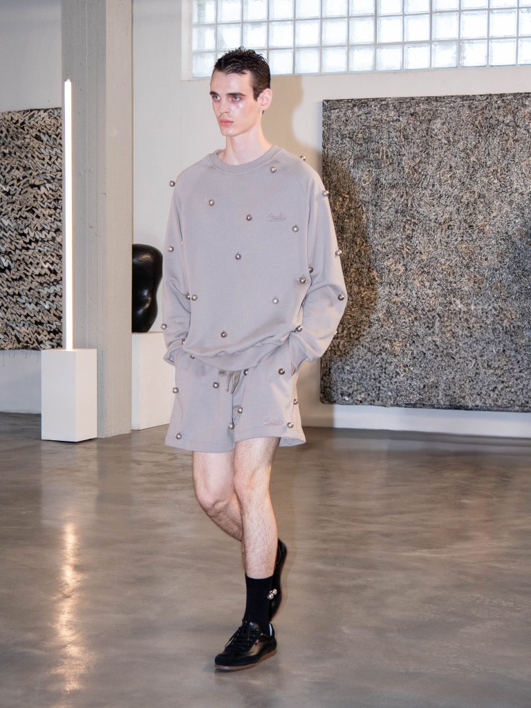 David Catalán’s SS26 collection opened with a runway full of movement, texture, and sound (literally). The sound of small bells attached to garments and every pair of socks echoed through the space with every step, adding rhythm to the show and making the whole experience feel lively. The collection leaned into a youthful, free-spirited vibe with relaxed tailoring, colorful shades, and playful accessories — like a cluster of bells that looks like a purse.