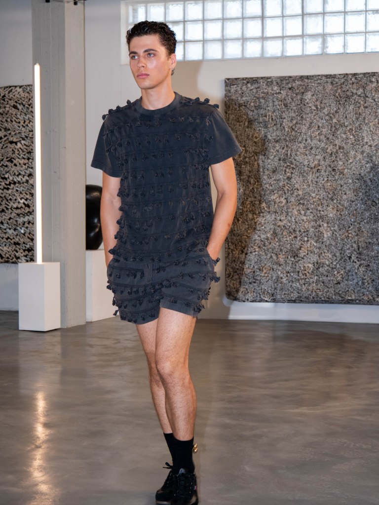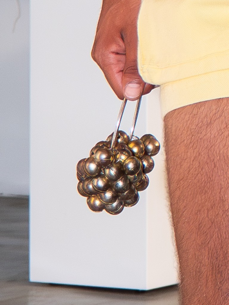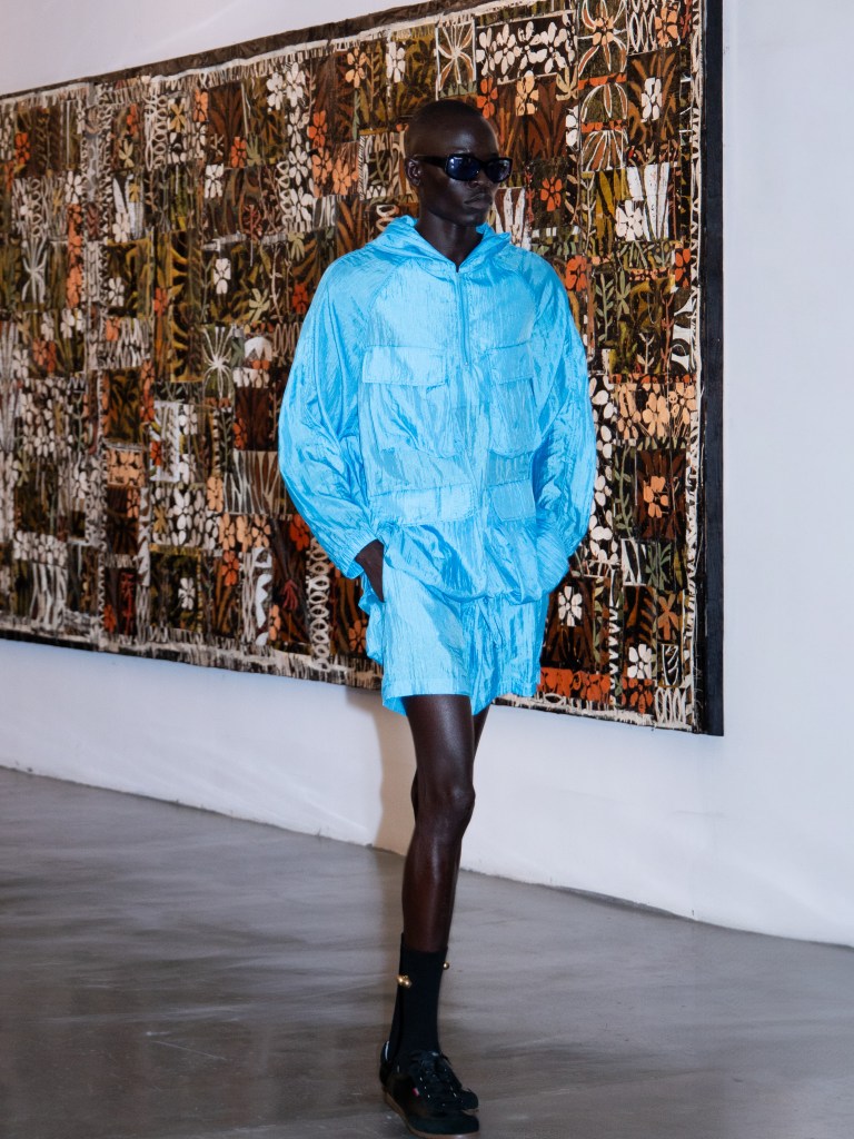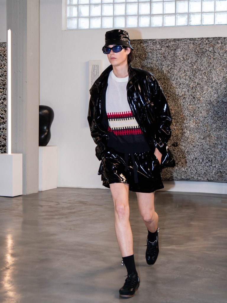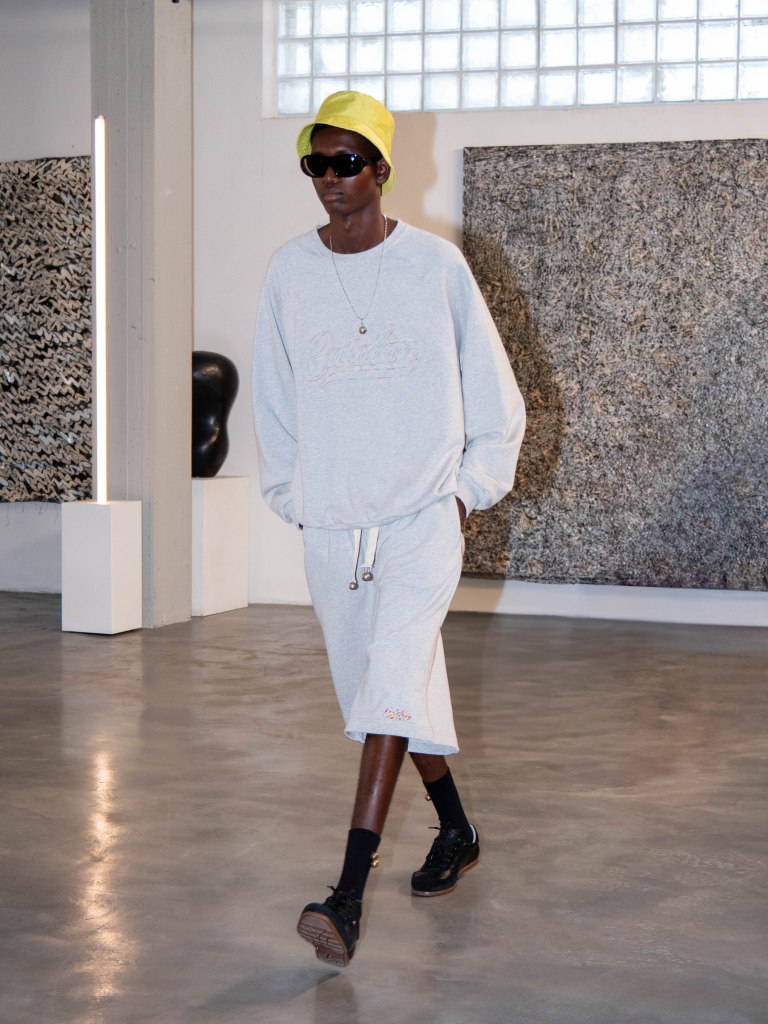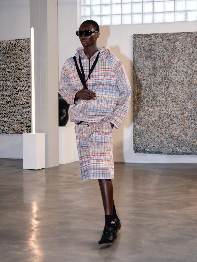 David Catalán’s SS26 collection opened with a runway full of movement, texture, and sound (literally). The sound of small bells attached to garments and every pair of socks echoed through the space with every step, adding rhythm to the show and making the whole experience feel lively. The collection leaned into a youthful, free-spirited vibe with relaxed tailoring, colorful shades, and playful accessories — like a cluster of bells that looks like a purse.