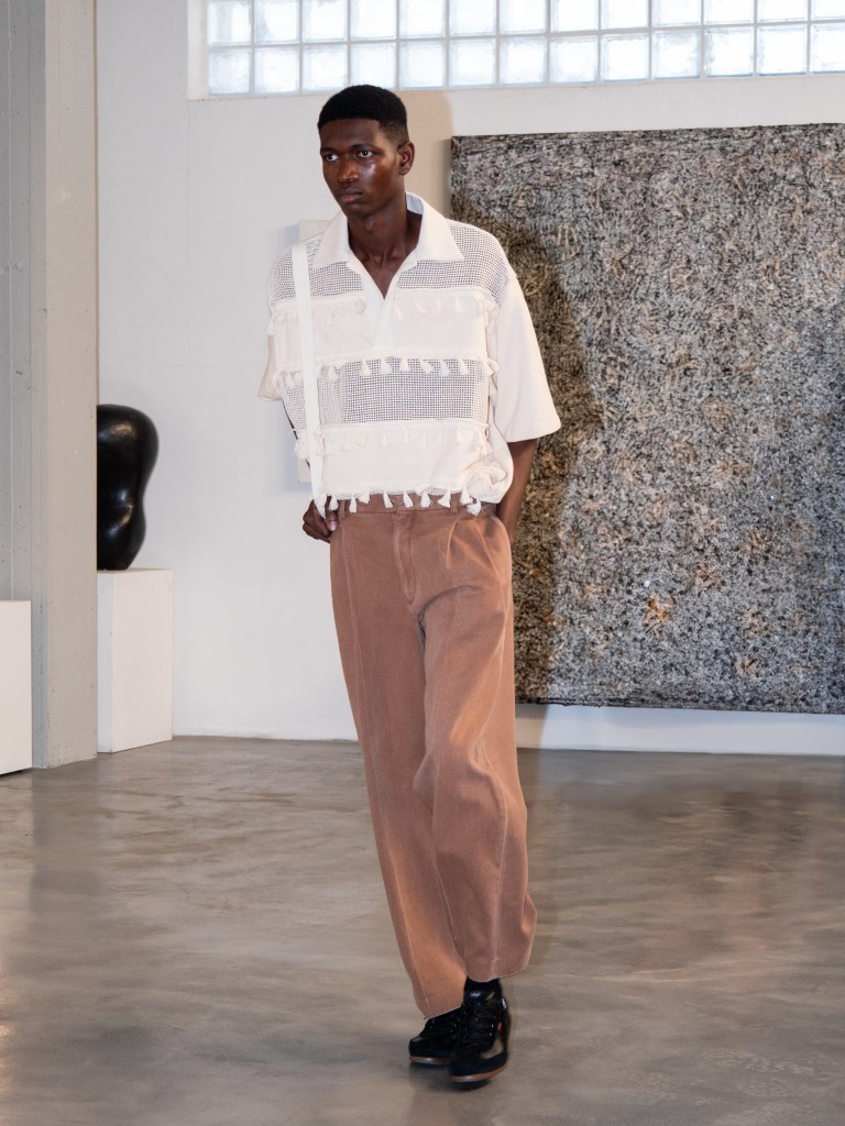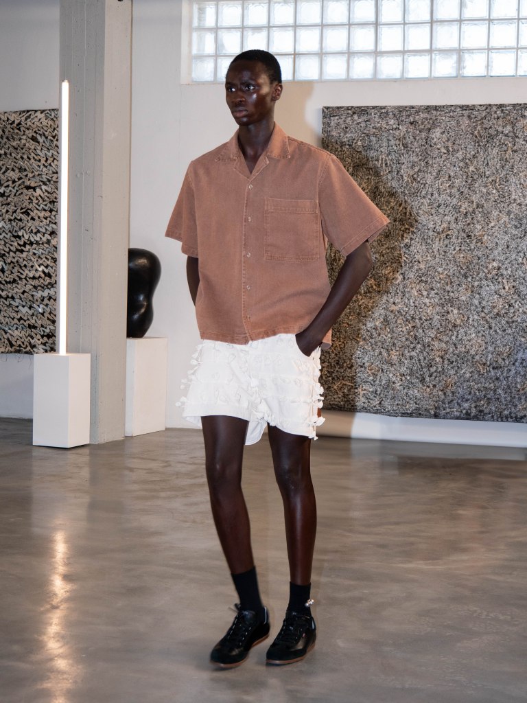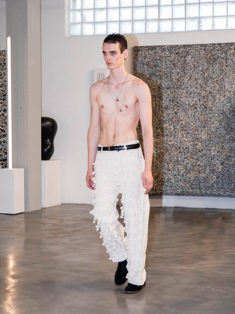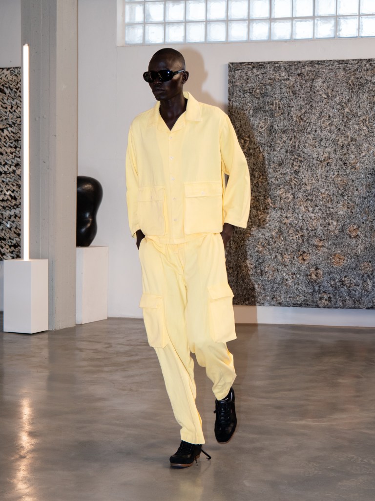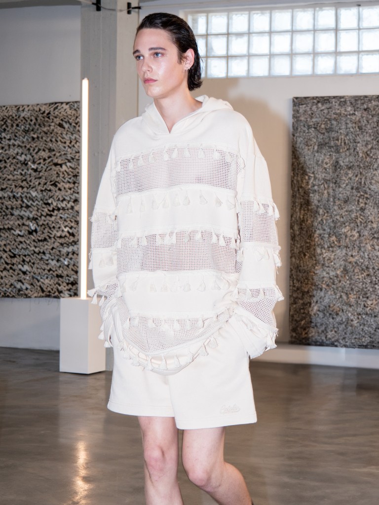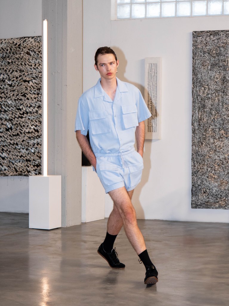 David Catalán’s SS26 collection opened with a runway full of movement, texture, and sound (literally). The sound of small bells attached to garments and every pair of socks echoed through the space with every step, adding rhythm to the show and making the whole experience feel lively. The collection leaned into a youthful, free-spirited vibe with relaxed tailoring, colorful shades, and playful accessories — like a cluster of bells that looks like a purse.