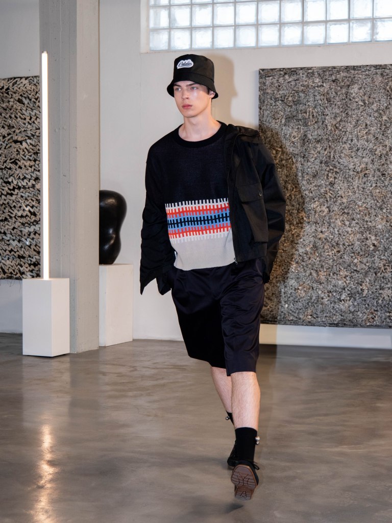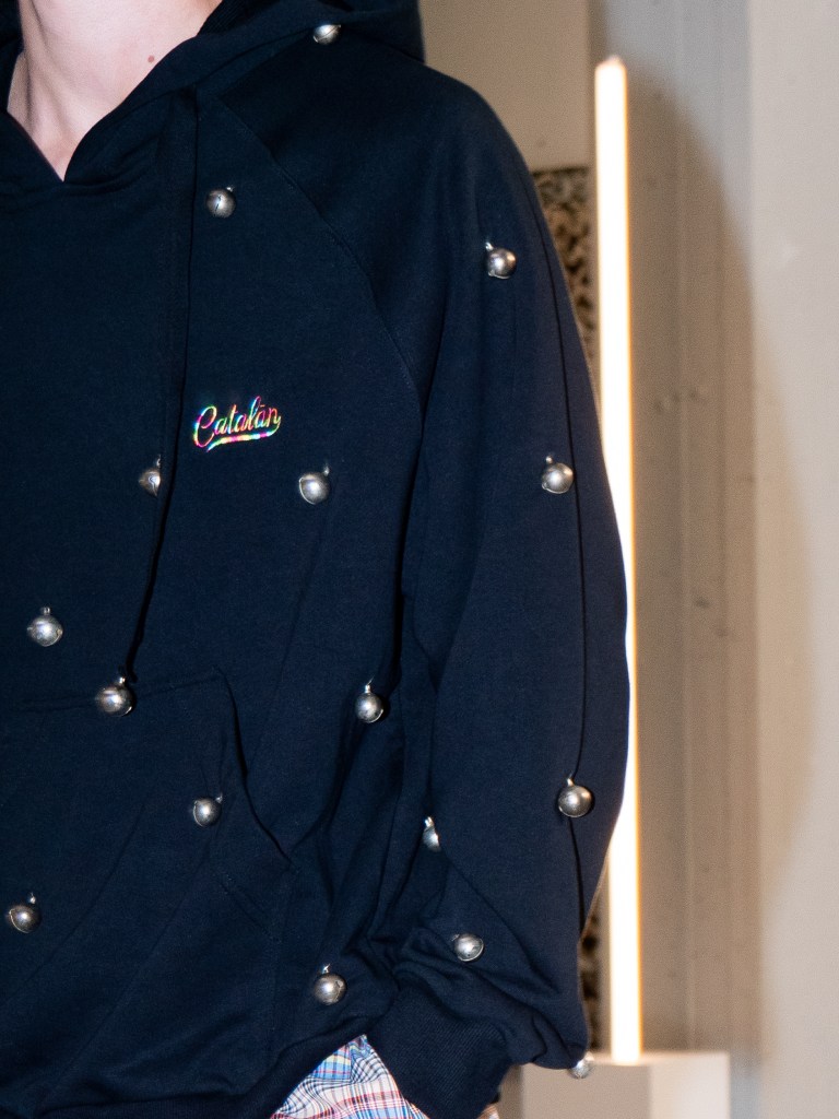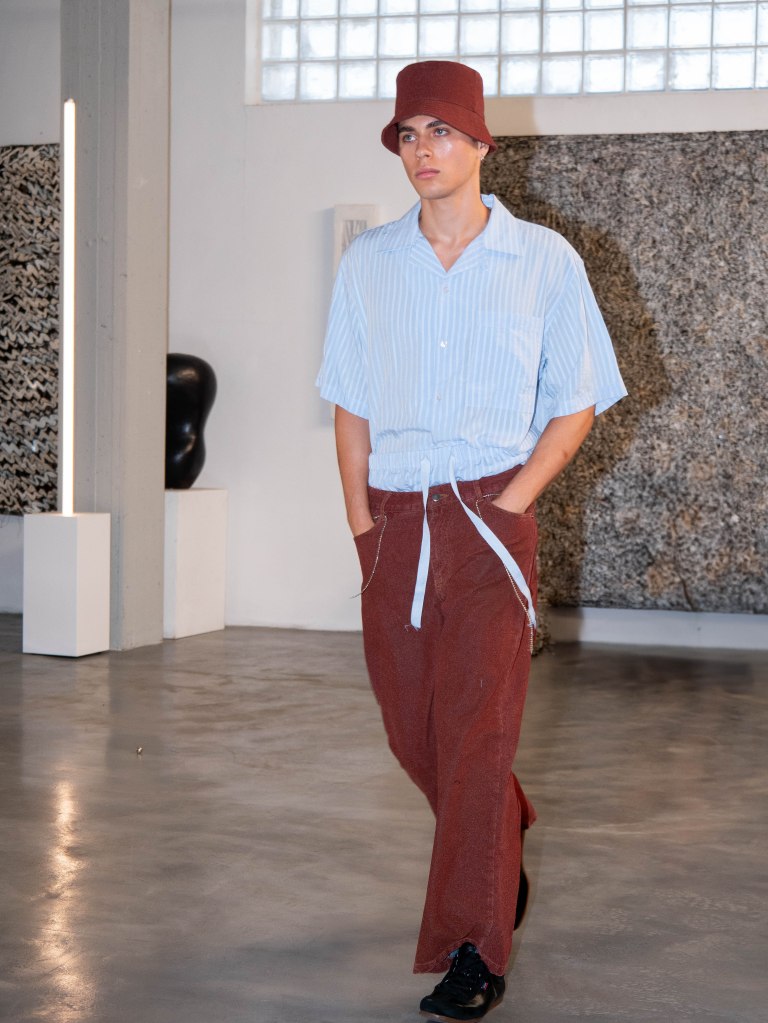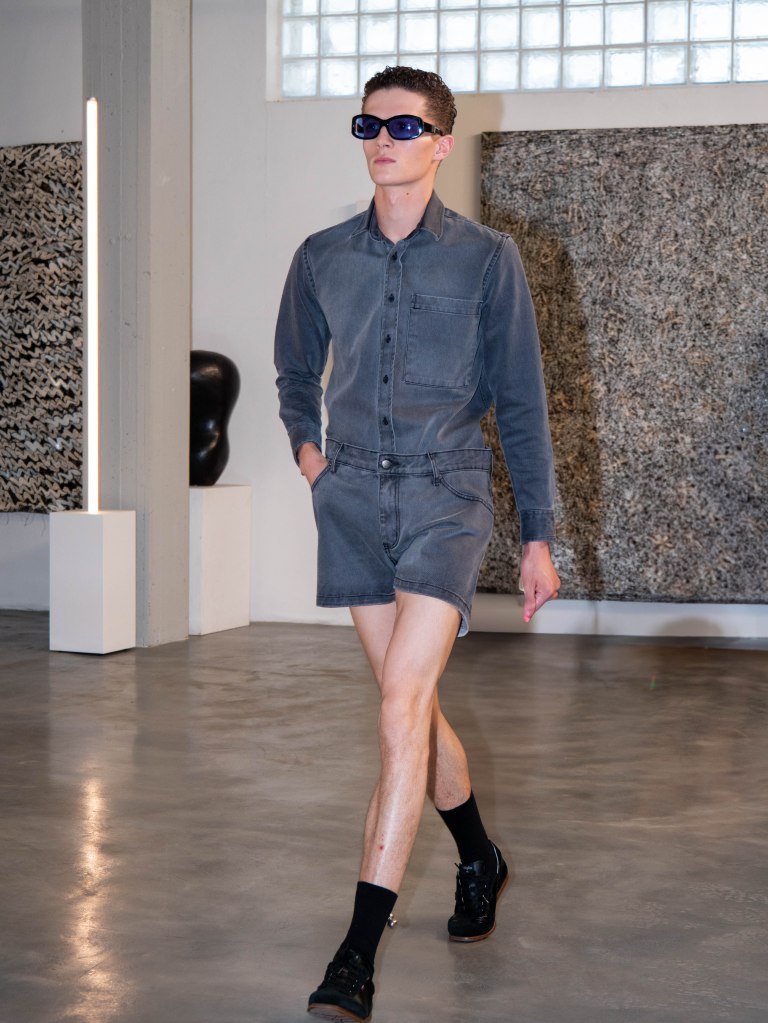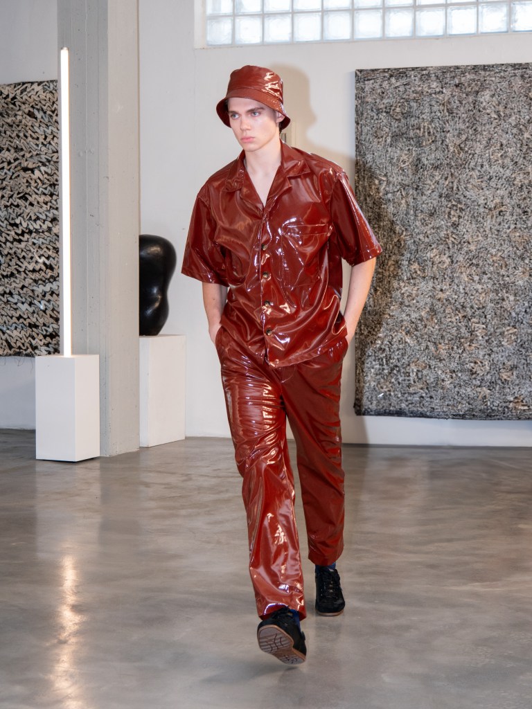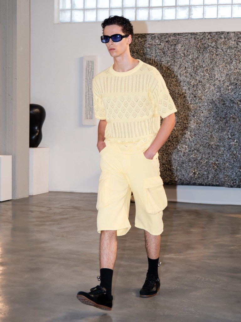 David Catalán’s SS26 collection opened with a runway full of movement, texture, and sound (literally). The sound of small bells attached to garments and every pair of socks echoed through the space with every step, adding rhythm to the show and making the whole experience feel lively. The collection leaned into a youthful, free-spirited vibe with relaxed tailoring, colorful shades, and playful accessories — like a cluster of bells that looks like a purse.