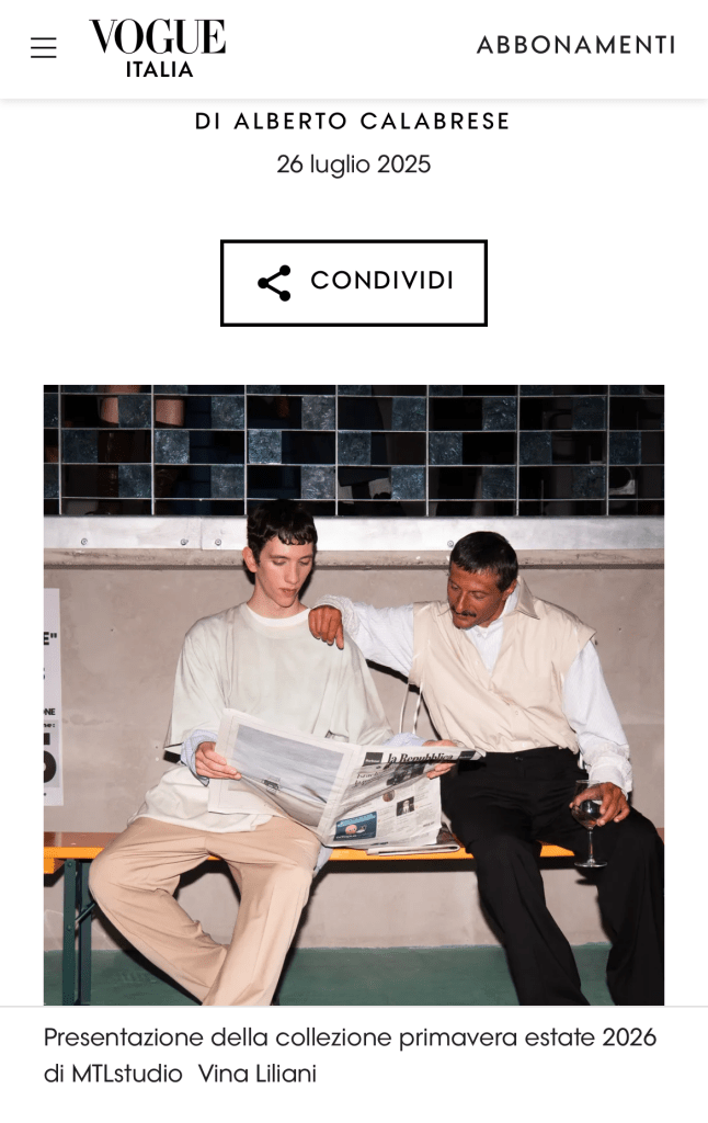 One of my shots from MTL Studio’s SS26 presentation was featured in a Vogue Italia article by Alberto Calabrese. In it, he introduces us to the world of MTL Studio and its founder Matteo Lamandini. Through his interview, we get a peek at how Matteo’s childhood memories, provincial roots, and personal history helped shape the brand’s aesthetic: a blend of tailoring and streetwear steeped in personal narrative.