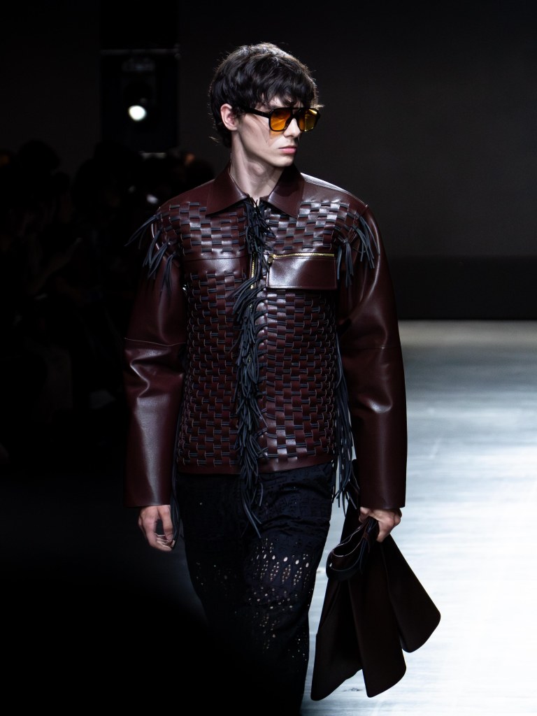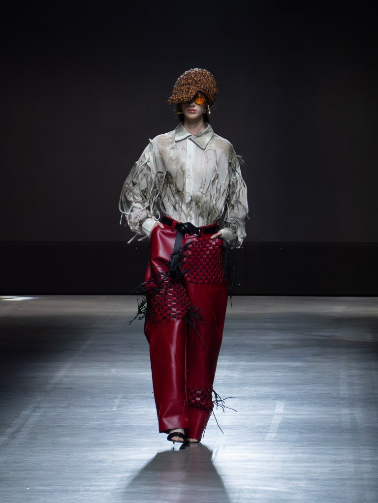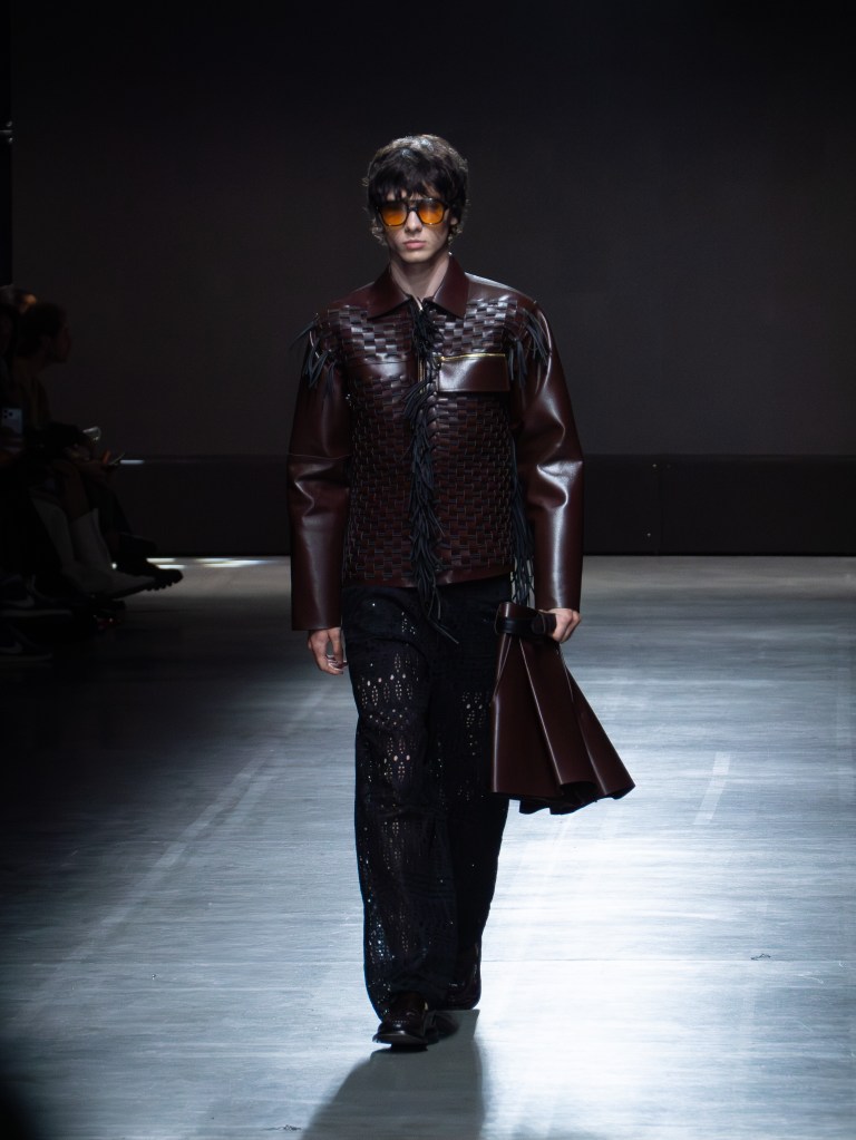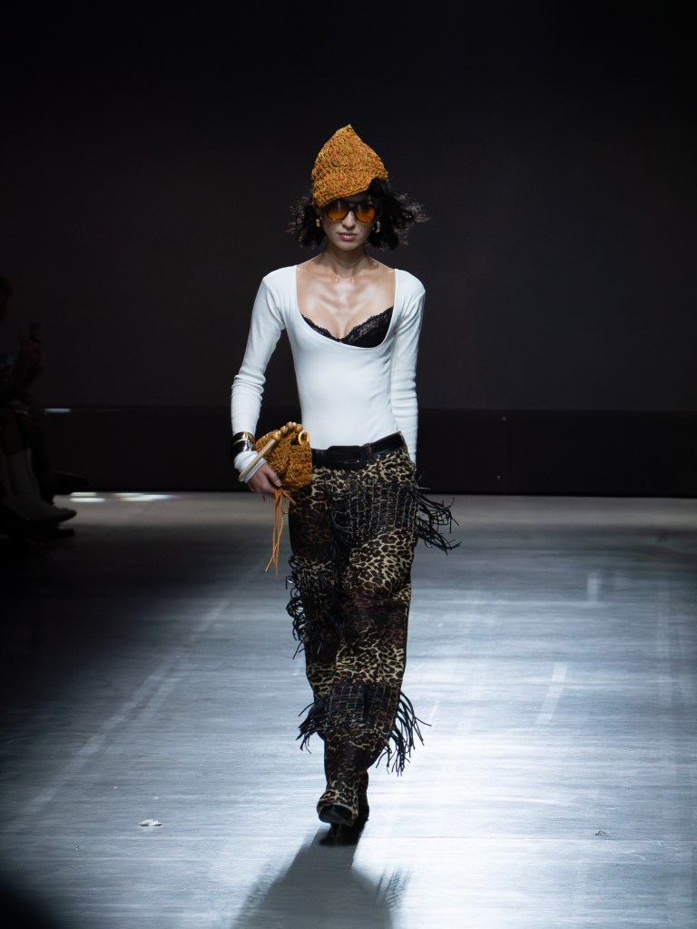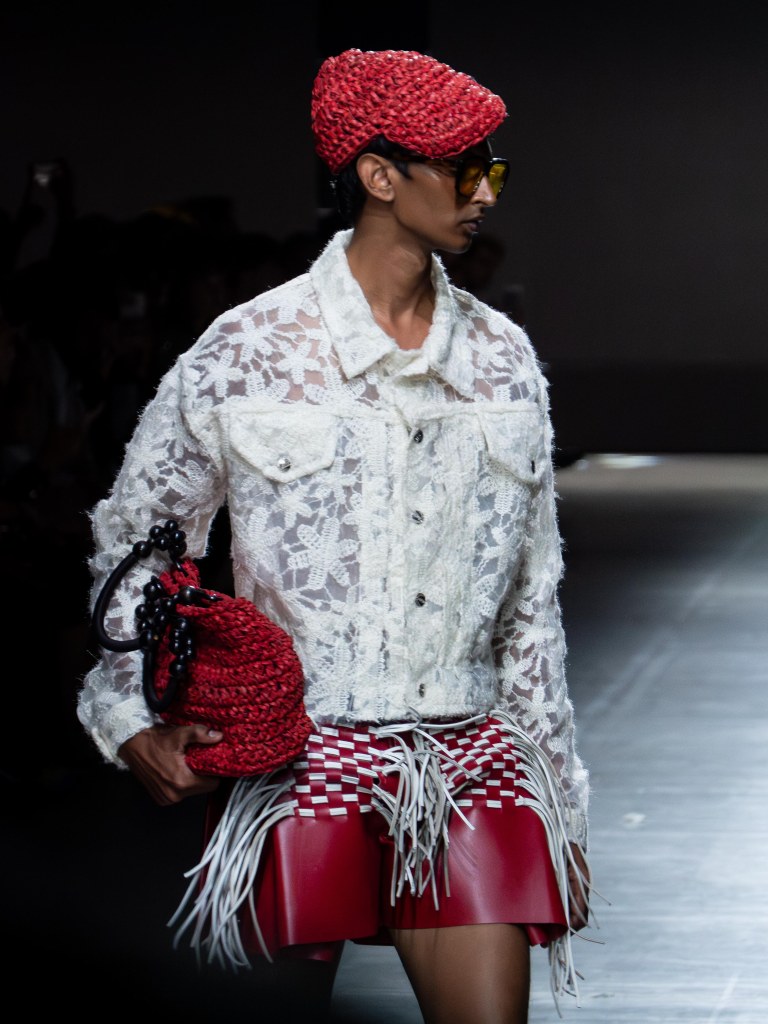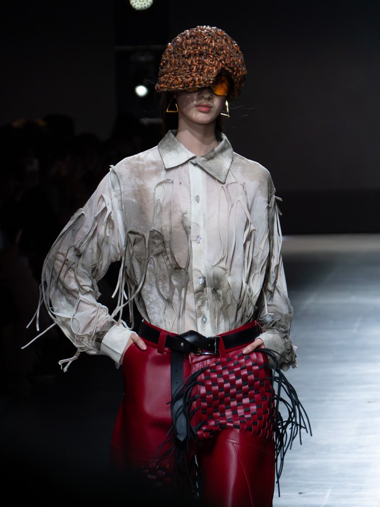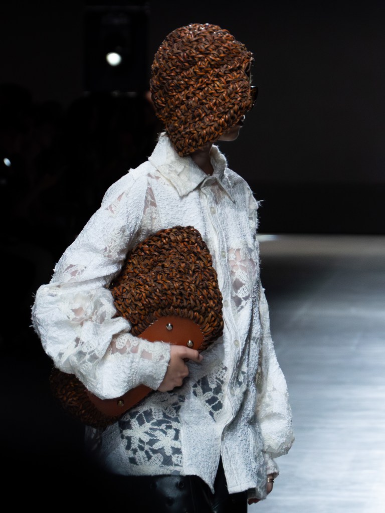The photo below shows one of the sharpest leather jackets I’ve seen so far. The weaving technique running from the hem up to the hood is insane. You’ll see that same technique on other pieces too, like the pants. And aside from the weaving, there were crochet bags and hats featured throughout the collection.