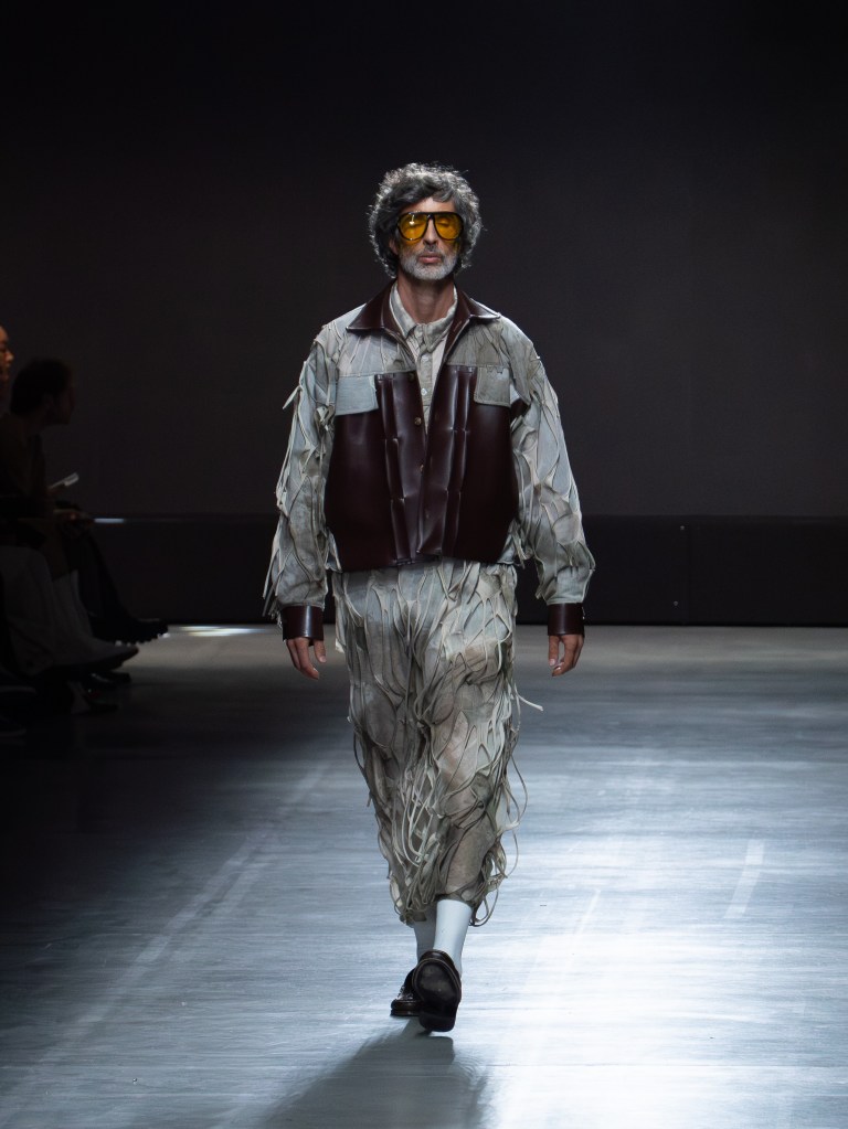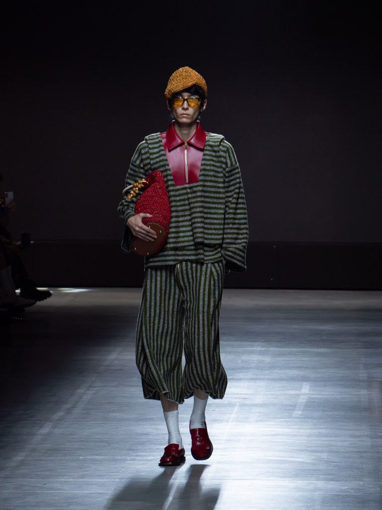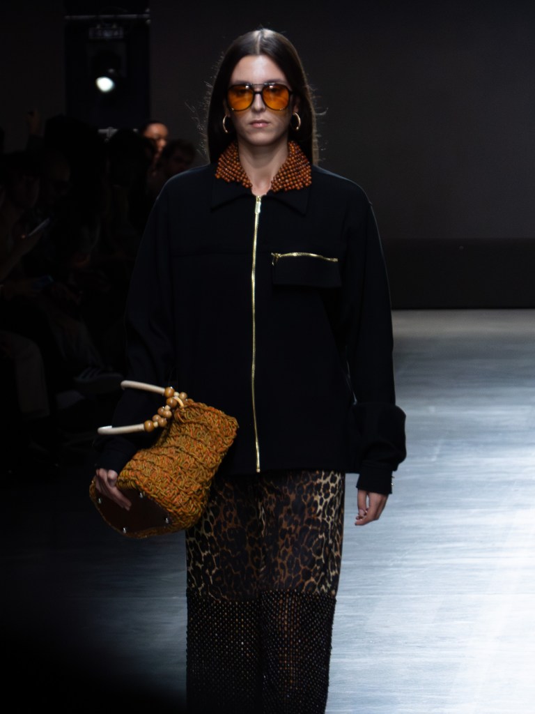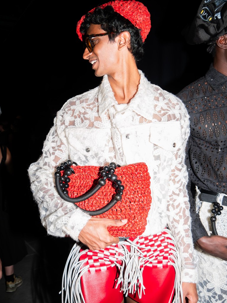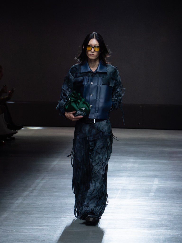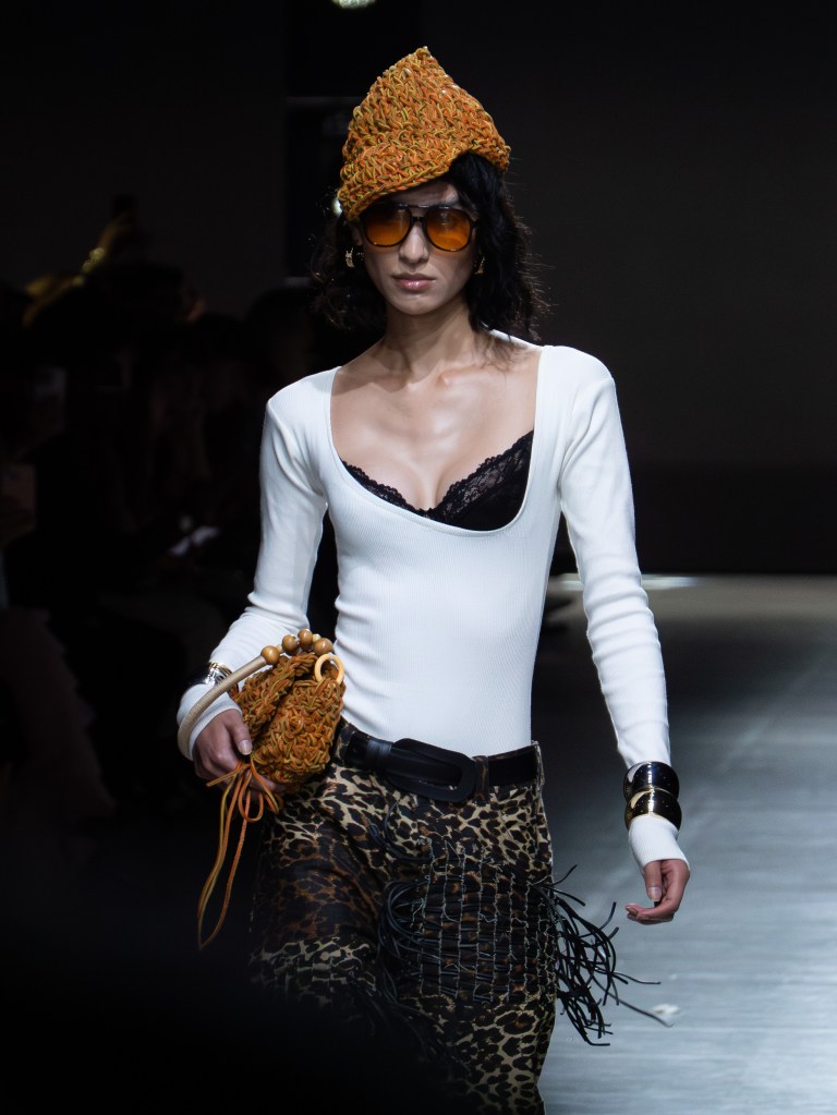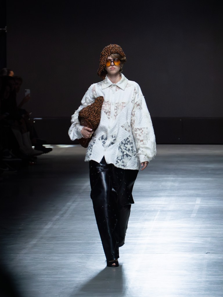 The photo below shows one of the sharpest leather jackets I’ve seen so far. The weaving technique running from the hem up to the hood is insane. You’ll see that same technique on other pieces too, like the pants. And aside from the weaving, there were crochet bags and hats featured throughout the collection.