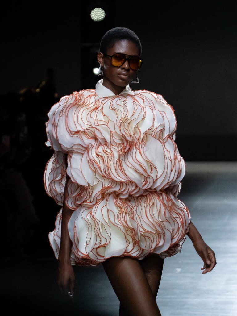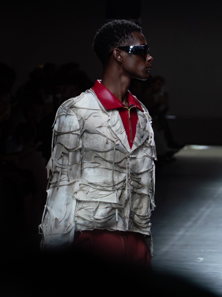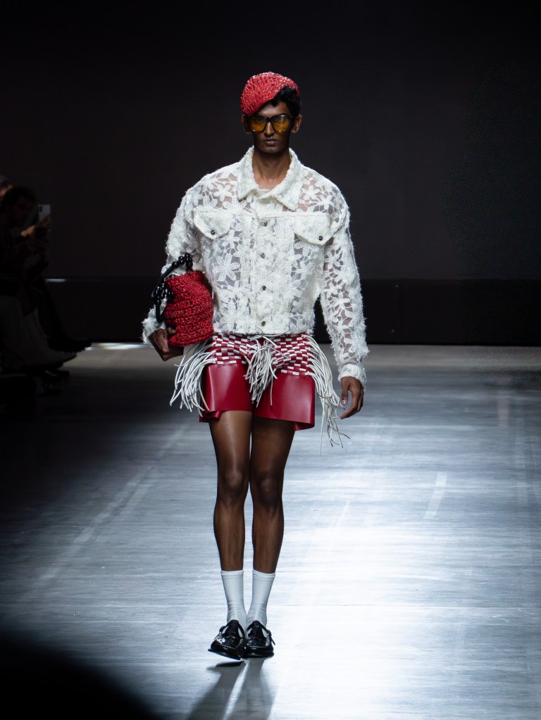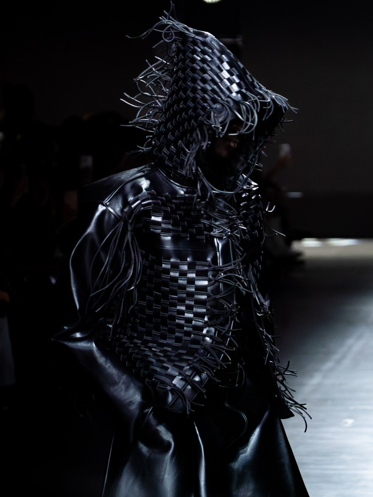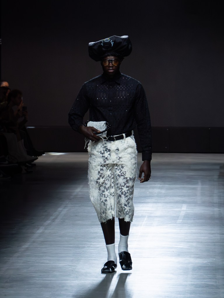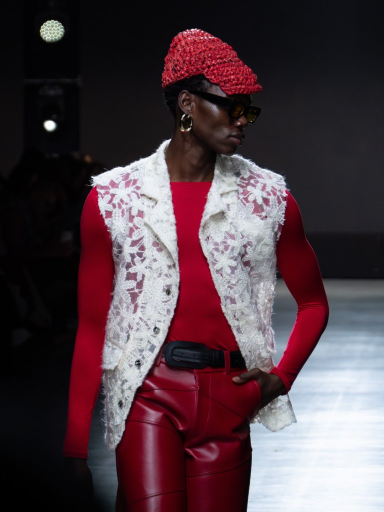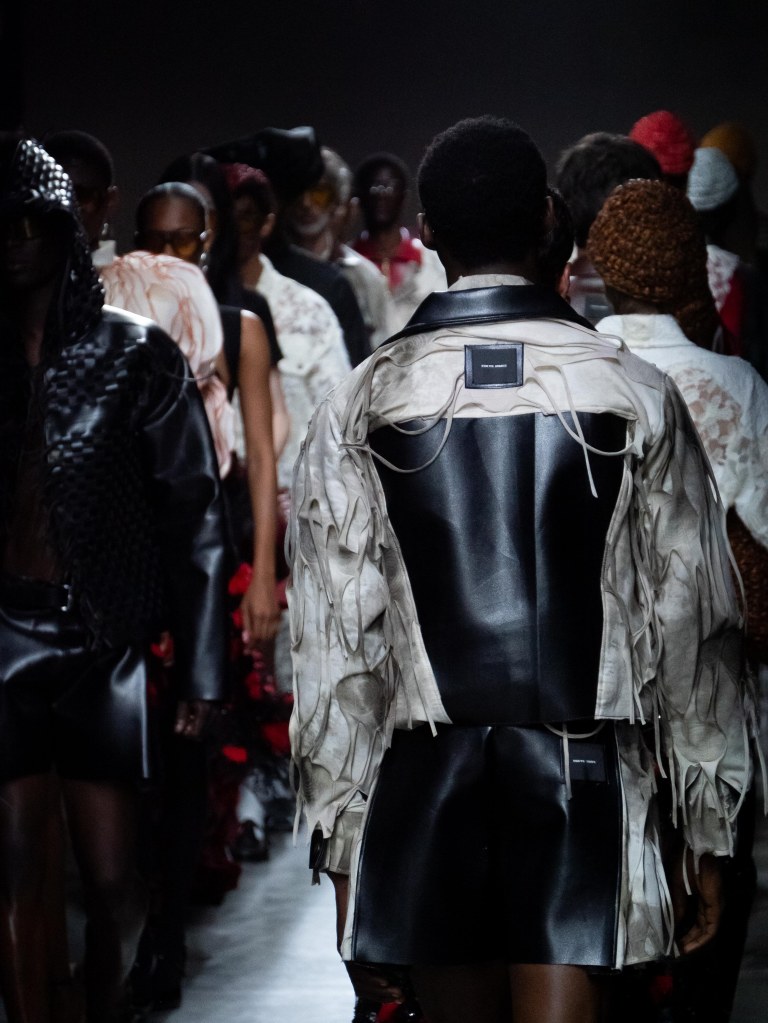 Tokyo James built this season around the idea of chaos and turned disruption into something intentional. The collection mixes sharp tailoring with striking fabric techniques. There was weaving, ruffles, embroidery, lace, and crochet accessories, all working together in a way that feels bold but controlled.
