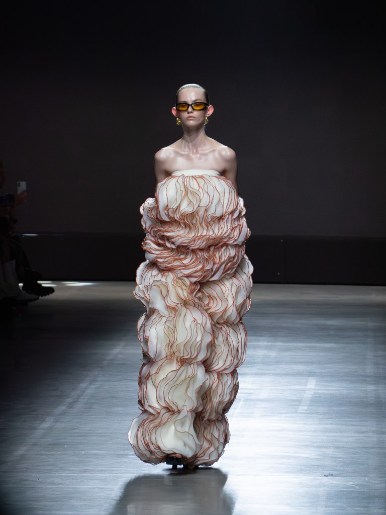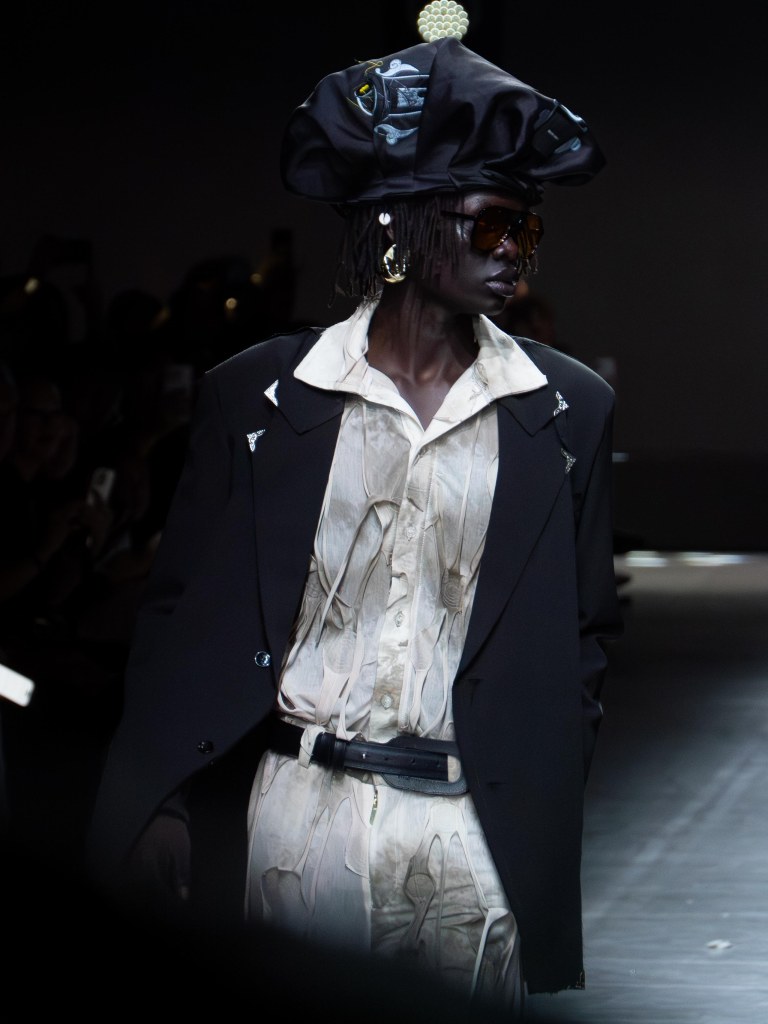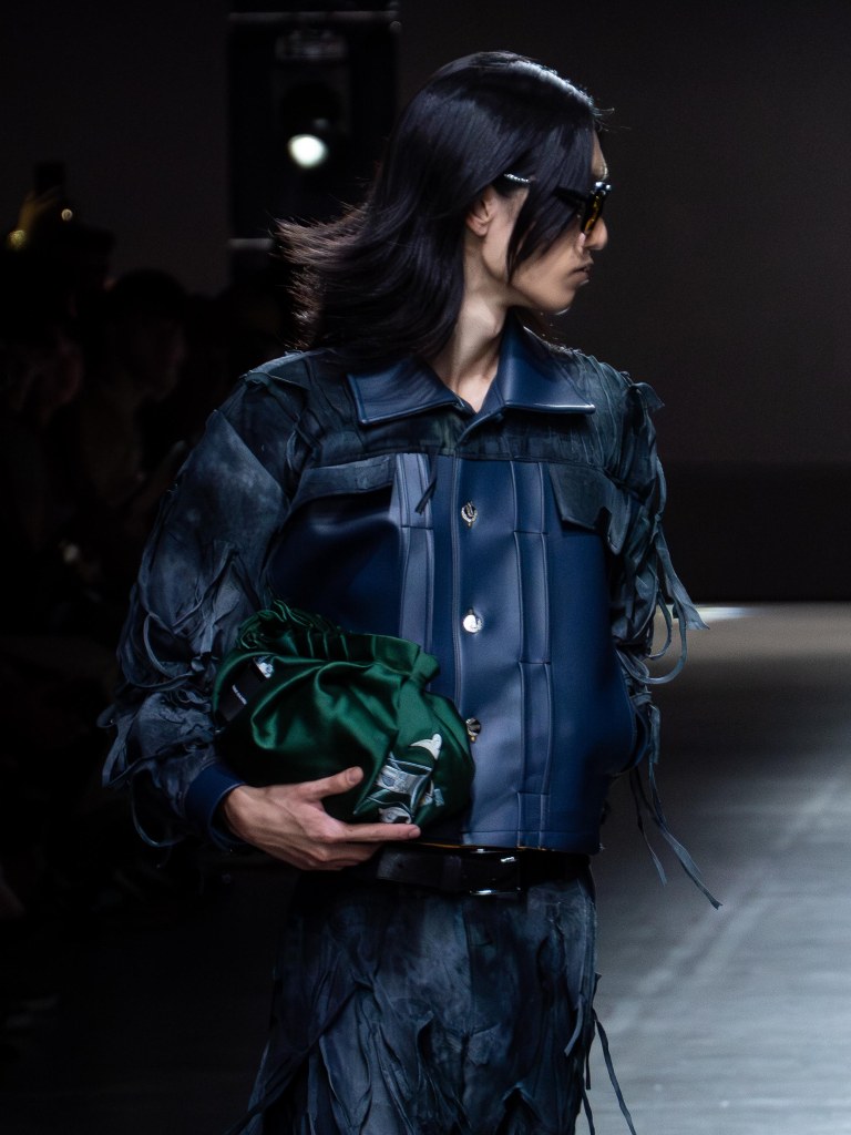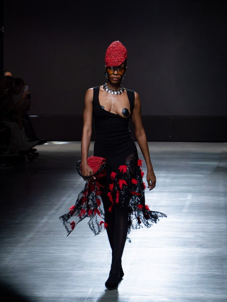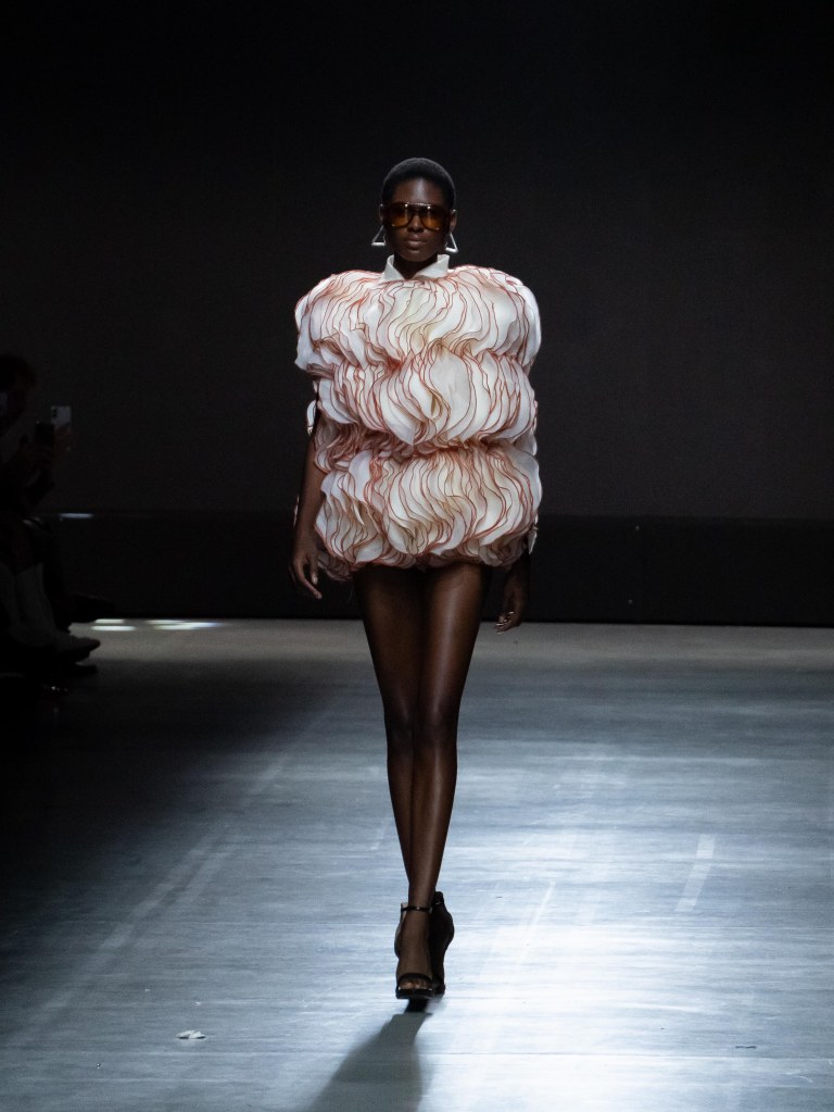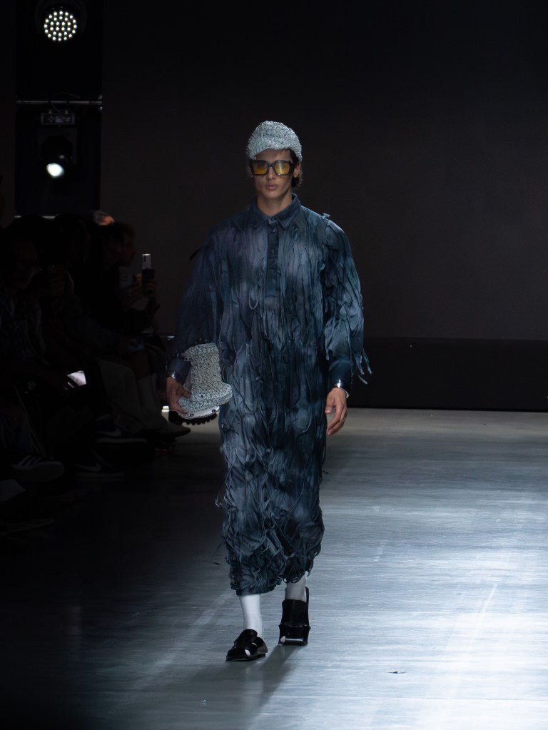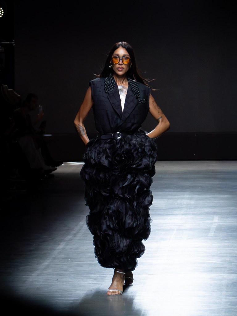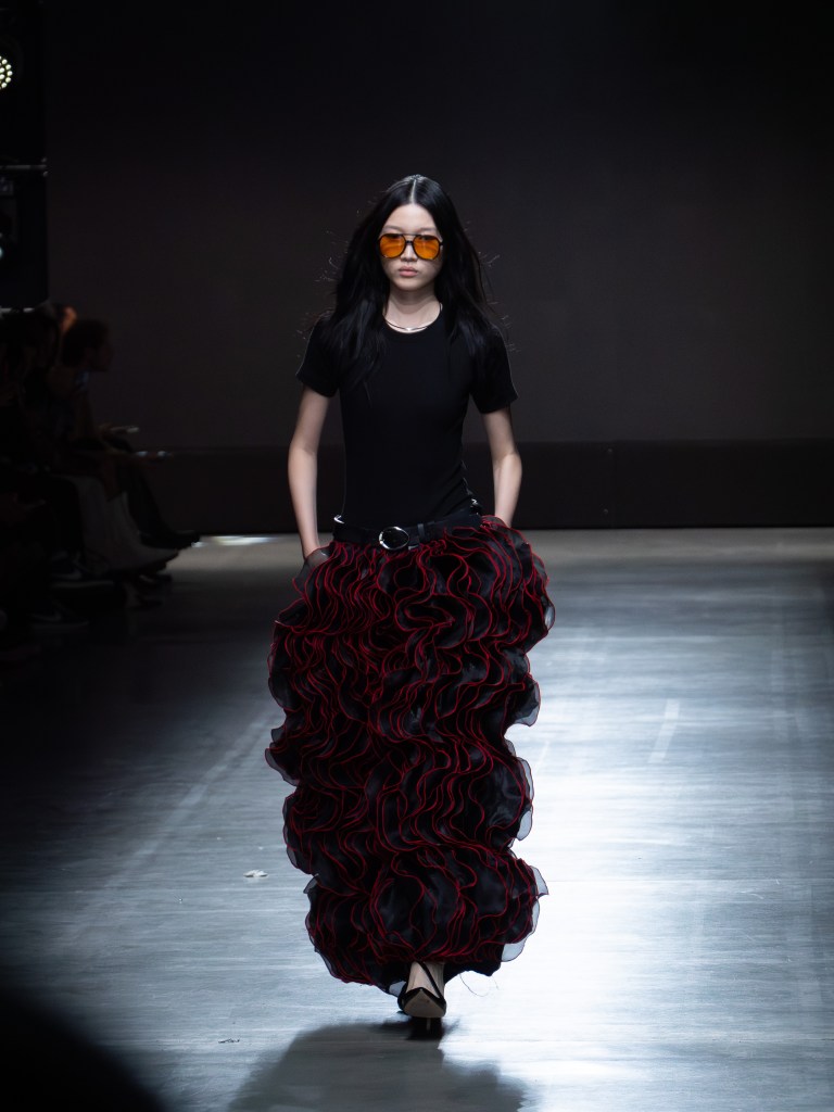 Tokyo James built this season around the idea of chaos and turned disruption into something intentional. The collection mixes sharp tailoring with striking fabric techniques. There was weaving, ruffles, embroidery, lace, and crochet accessories, all working together in a way that feels bold but controlled.