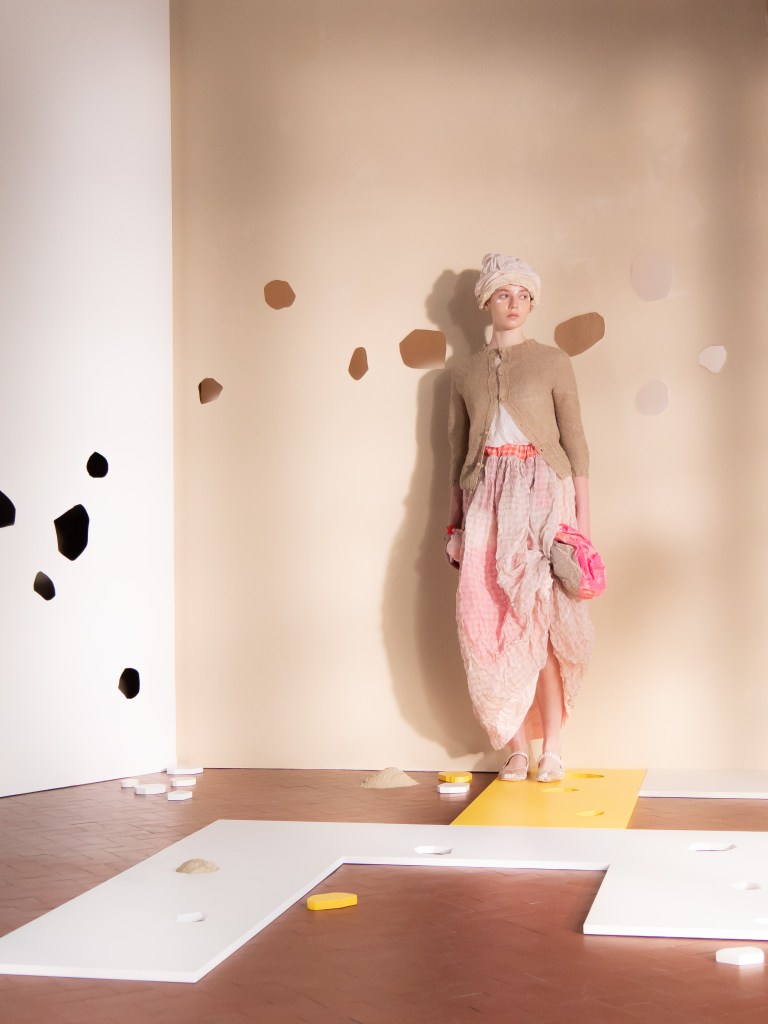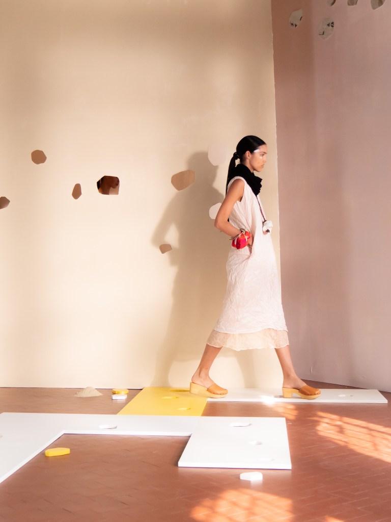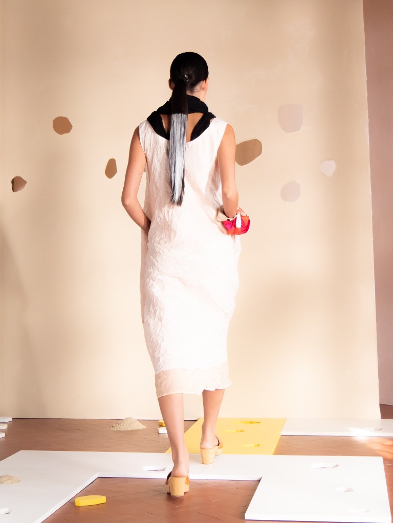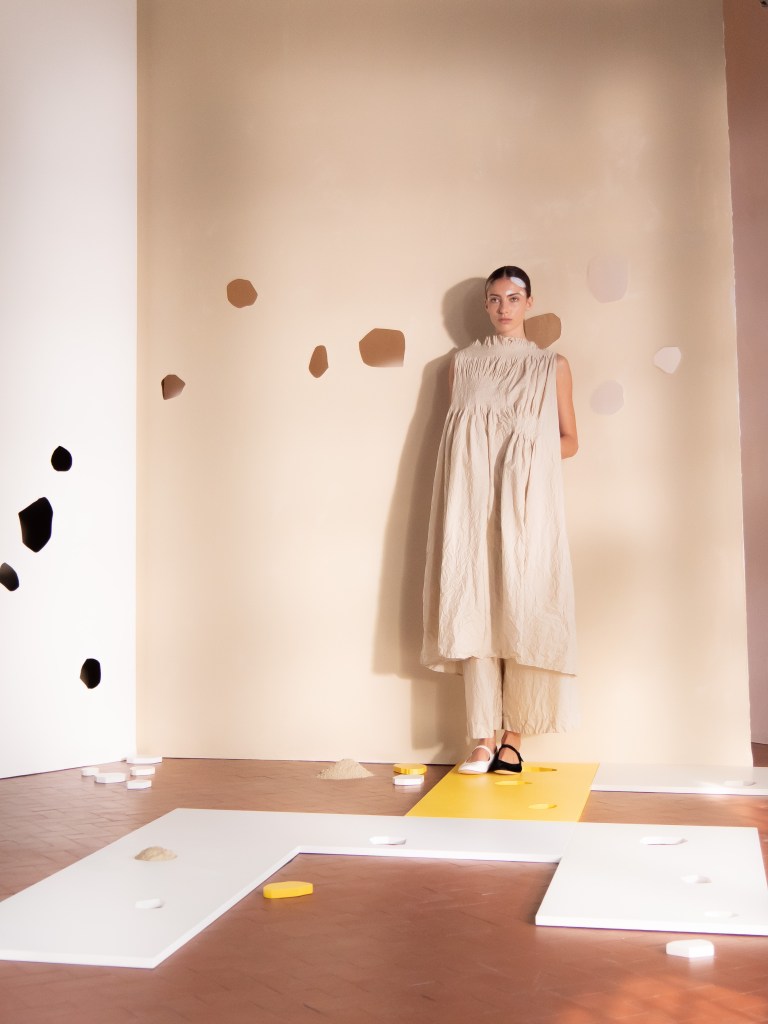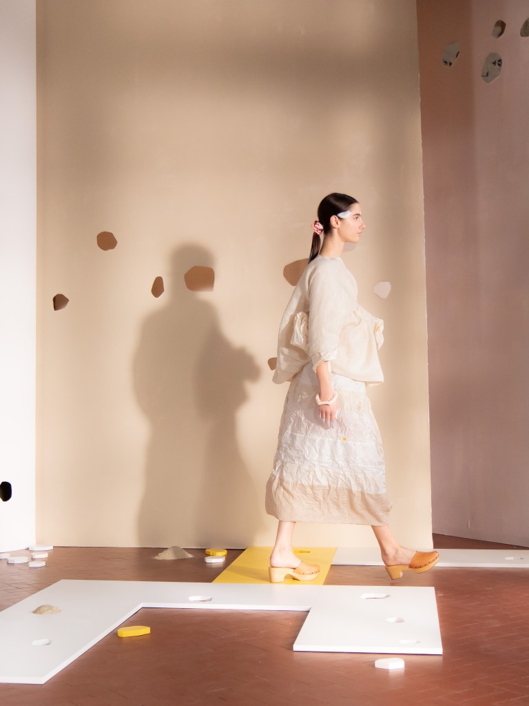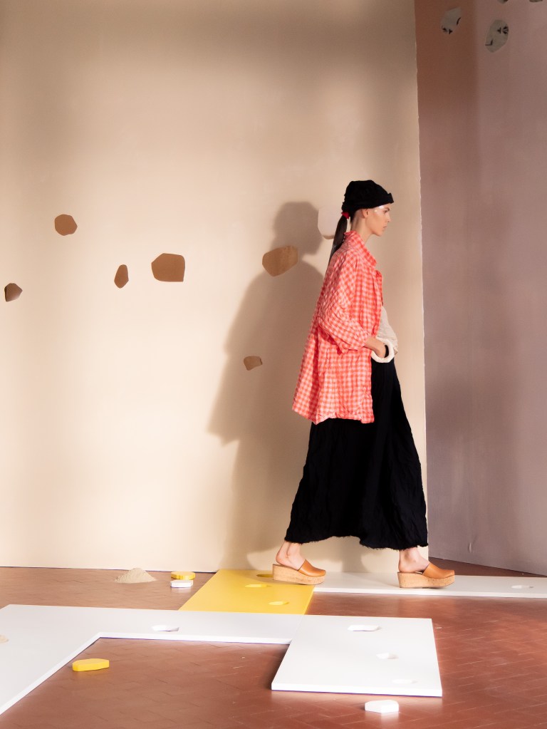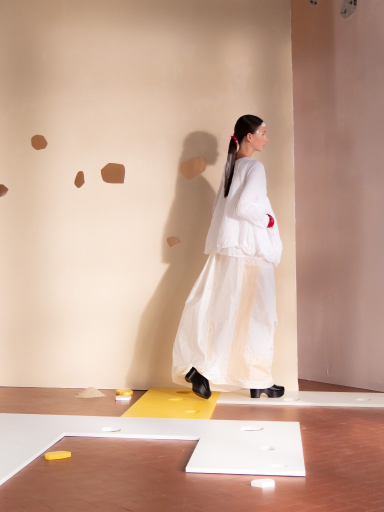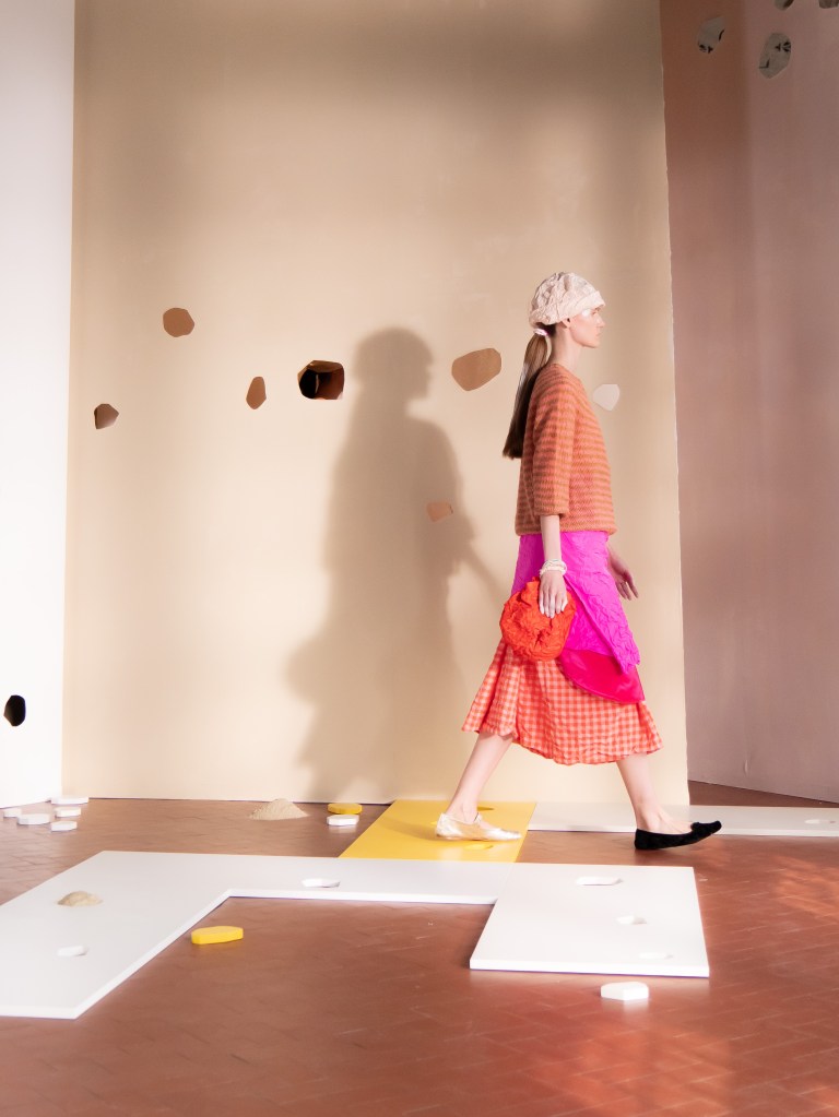 Light, color, joy “…ma perché rosa?” That is the title of Daniela Gregis SS26, and the whole show felt like stepping into her idea of sun and seaside. She brought this soft, warm atmosphere into Milan Fashion Week with a stage built in beige and white, full of irregular cut-outs that mimic rocks or cliffs by the shore. Right next to it was a huge window that let the light spill in. It was artificial this time because the weather was miserable, but honestly it still felt poetic in its own way. The runway itself wasn’t linear. It moved in little paths, almost like those wooden walkways you take toward the water. Because of that layout, I managed to capture some layered compositions of the final walk with several models crossing in different directions in the same frame. It looked beautiful in motion and even better frozen in a single shot.