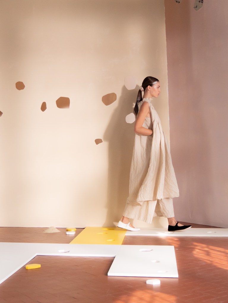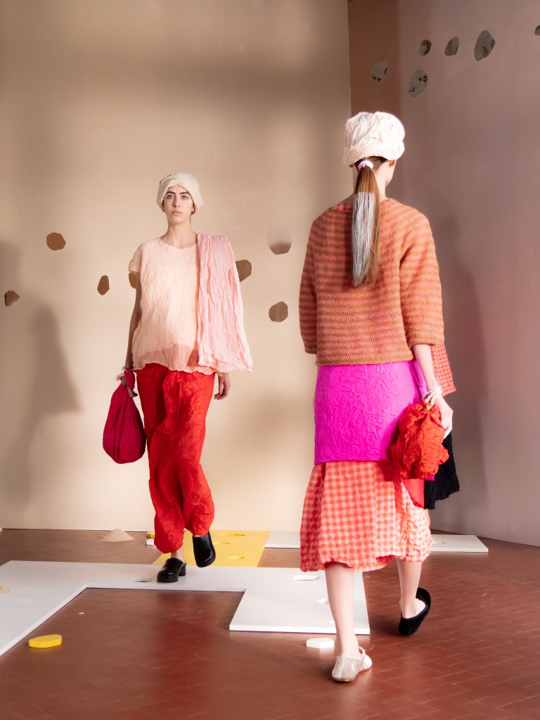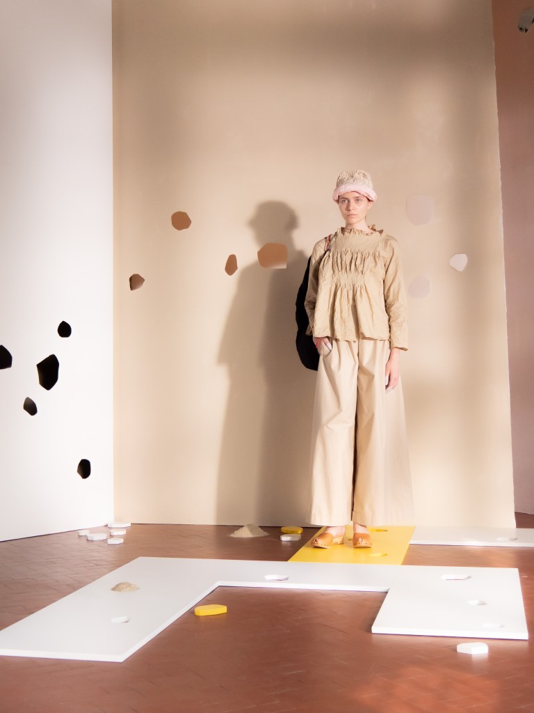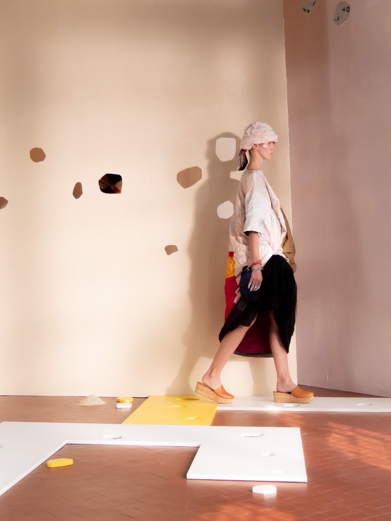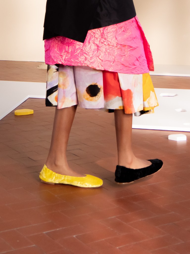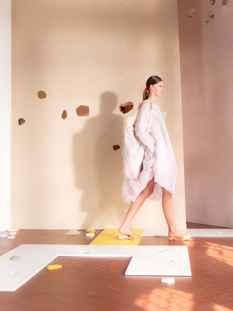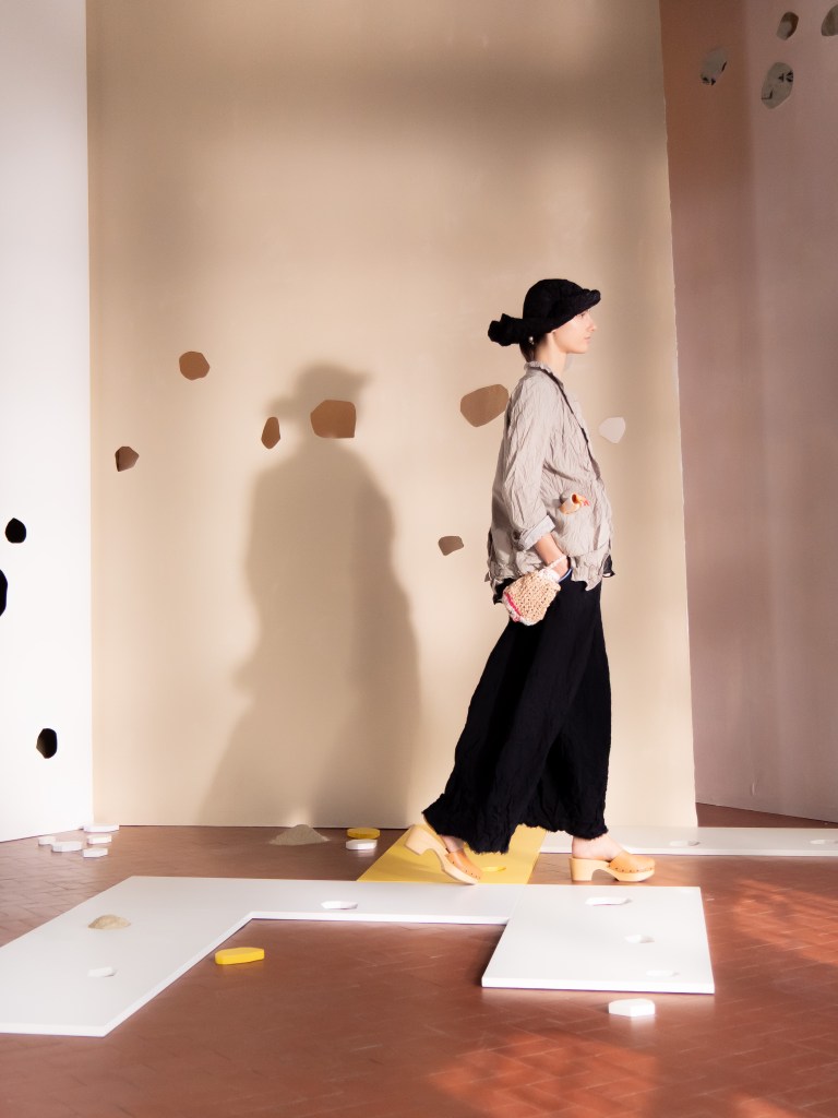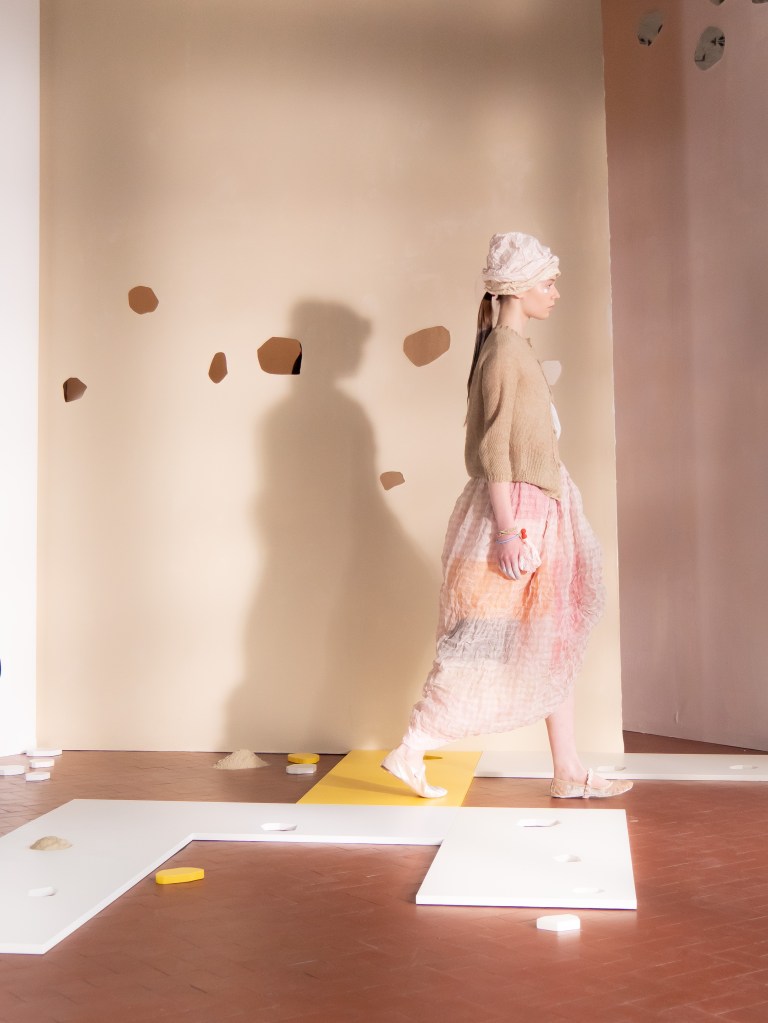 Light, color, joy “…ma perché rosa?” That is the title of Daniela Gregis SS26, and the whole show felt like stepping into her idea of sun and seaside. She brought this soft, warm atmosphere into Milan Fashion Week with a stage built in beige and white, full of irregular cut-outs that mimic rocks or cliffs by the shore. Right next to it was a huge window that let the light spill in. It was artificial this time because the weather was miserable, but honestly it still felt poetic in its own way. The runway itself wasn’t linear. It moved in little paths, almost like those wooden walkways you take toward the water. Because of that layout, I managed to capture some layered compositions of the final walk with several models crossing in different directions in the same frame. It looked beautiful in motion and even better frozen in a single shot.