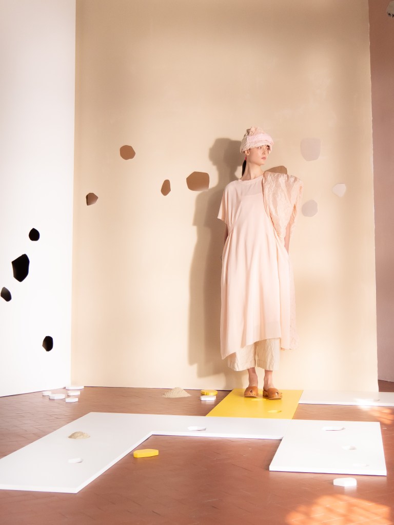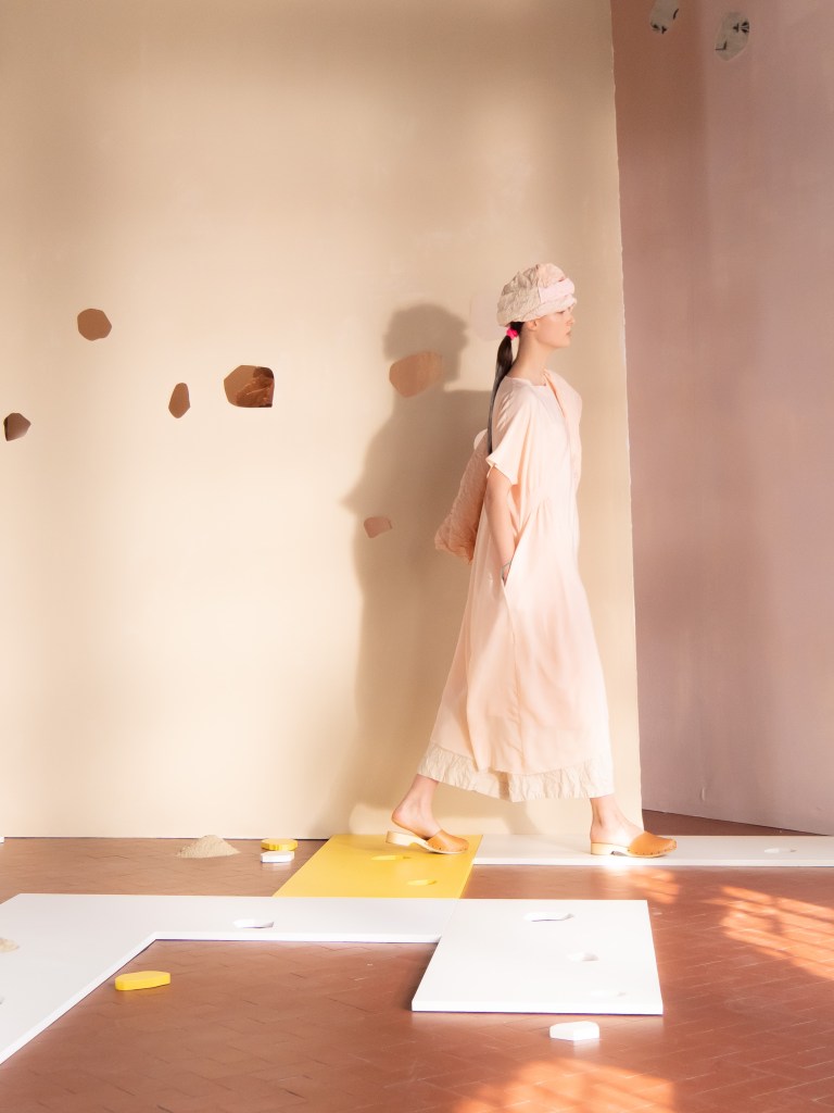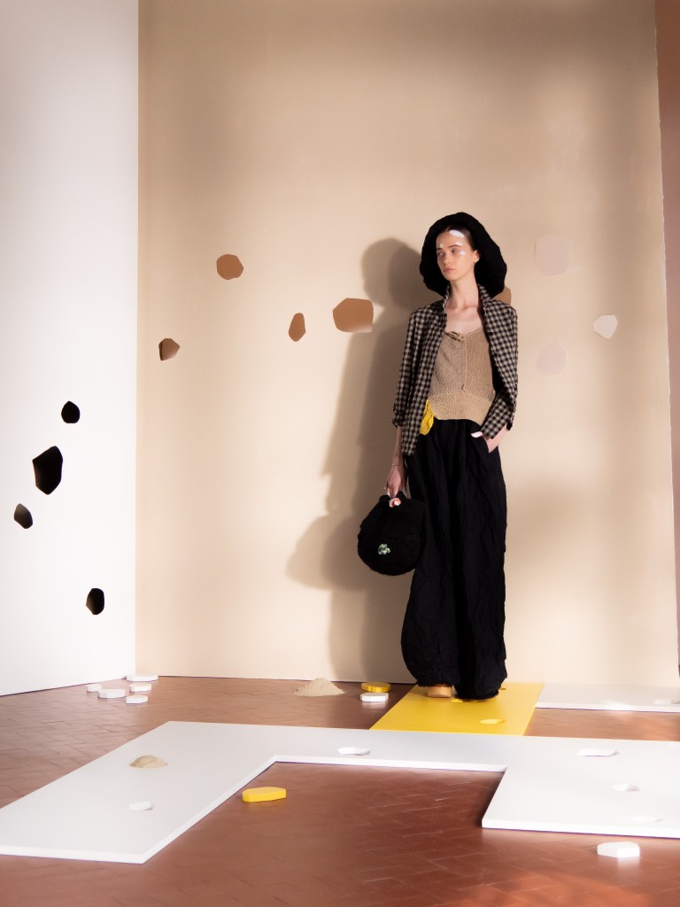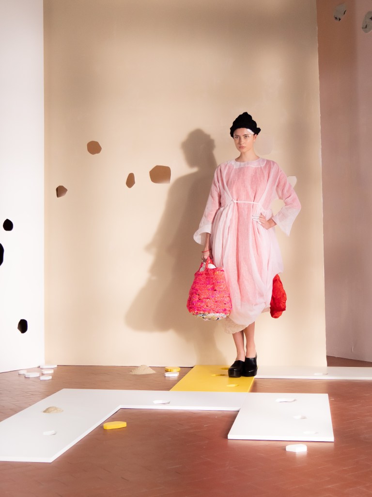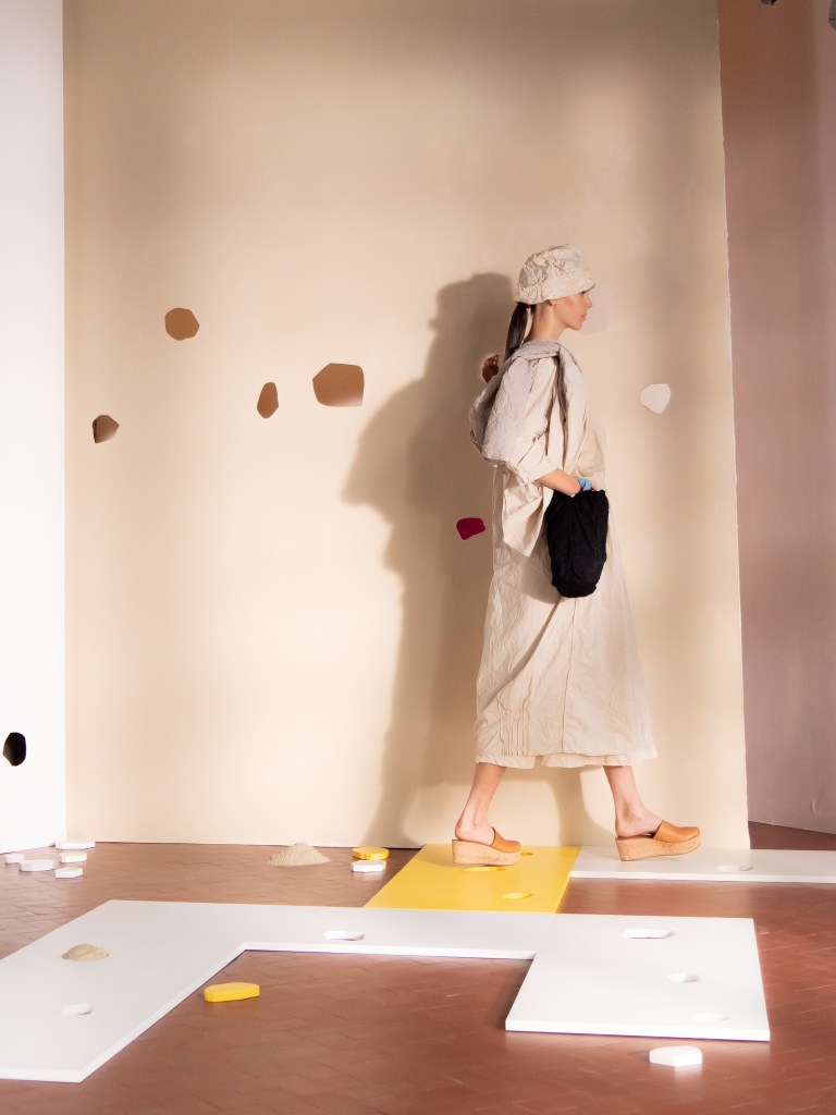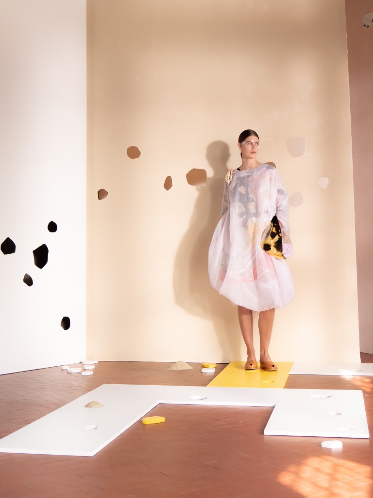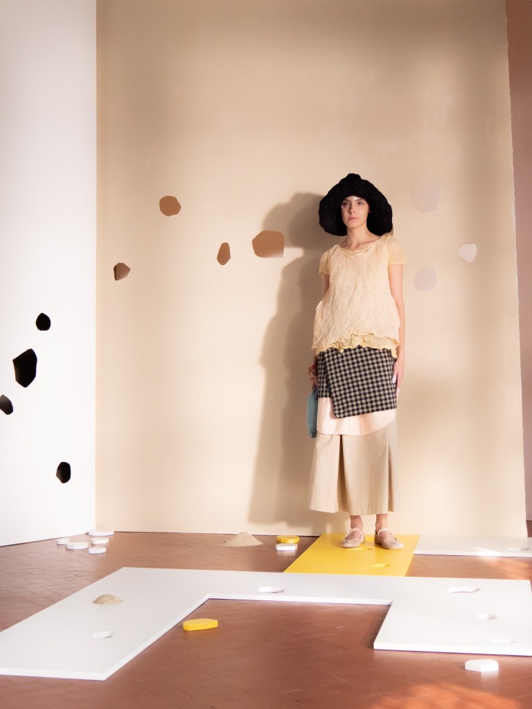 Light, color, joy “…ma perché rosa?” That is the title of Daniela Gregis SS26, and the whole show felt like stepping into her idea of sun and seaside. She brought this soft, warm atmosphere into Milan Fashion Week with a stage built in beige and white, full of irregular cut-outs that mimic rocks or cliffs by the shore. Right next to it was a huge window that let the light spill in. It was artificial this time because the weather was miserable, but honestly it still felt poetic in its own way. The runway itself wasn’t linear. It moved in little paths, almost like those wooden walkways you take toward the water. Because of that layout, I managed to capture some layered compositions of the final walk with several models crossing in different directions in the same frame. It looked beautiful in motion and even better frozen in a single shot.