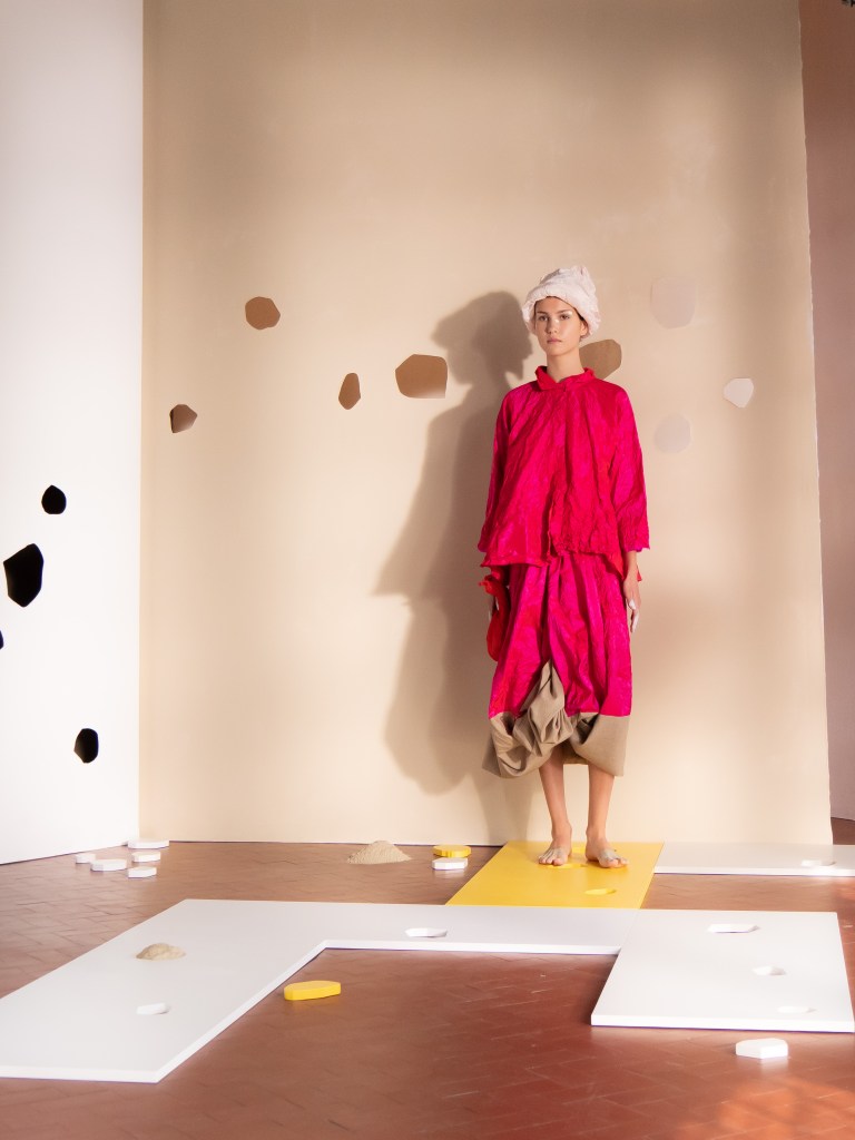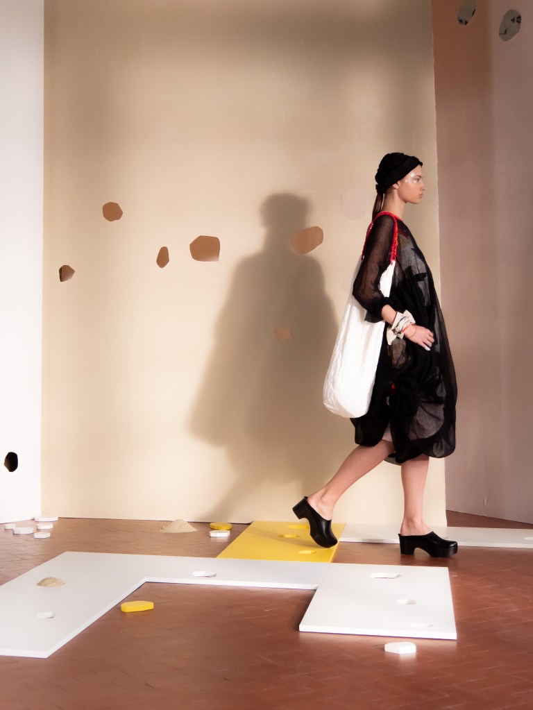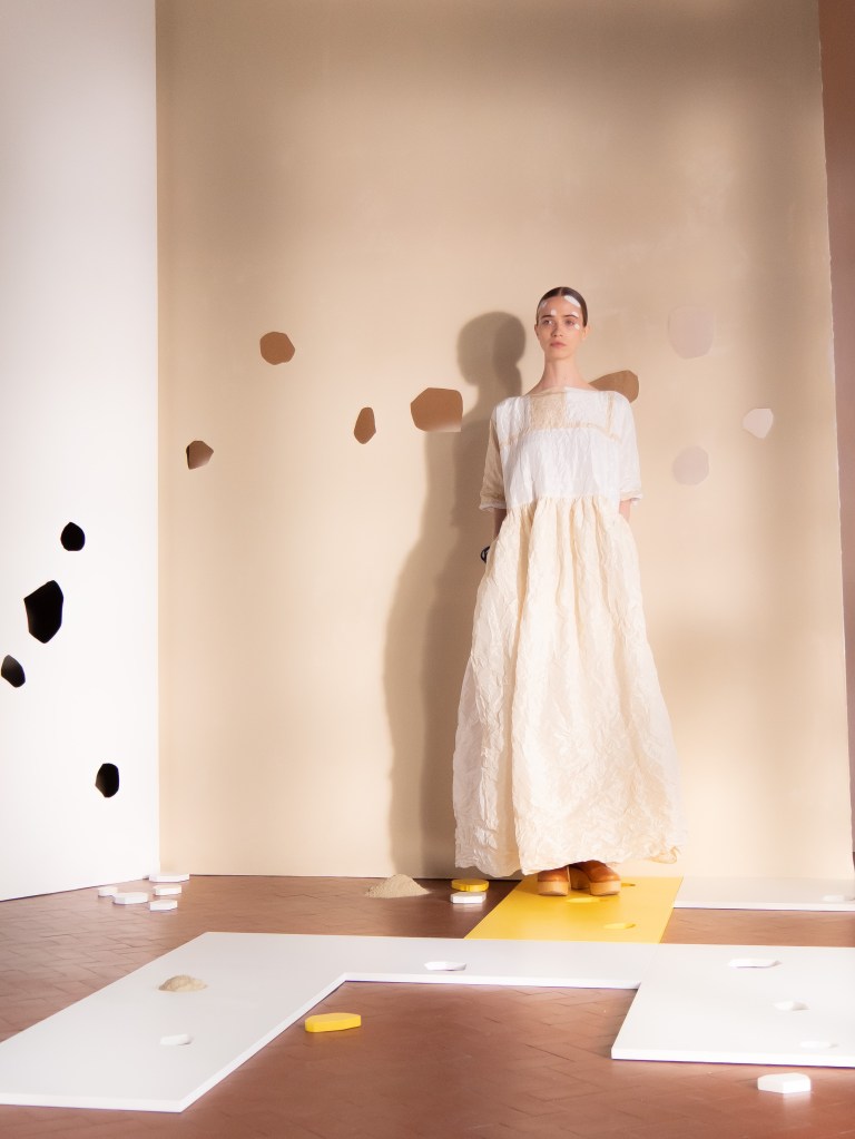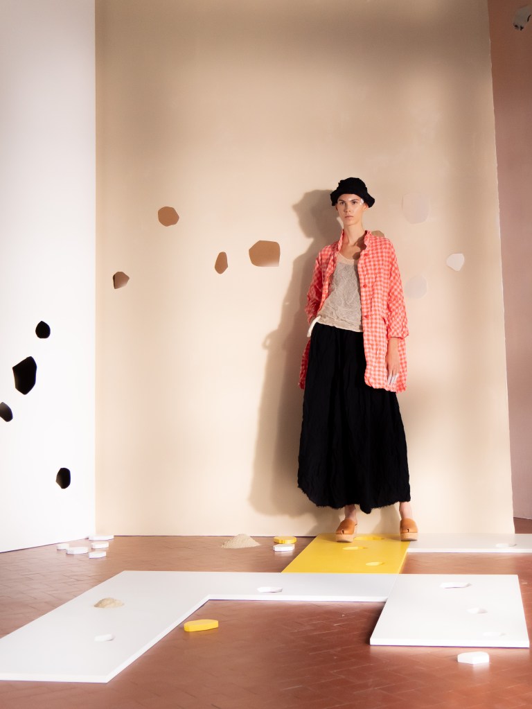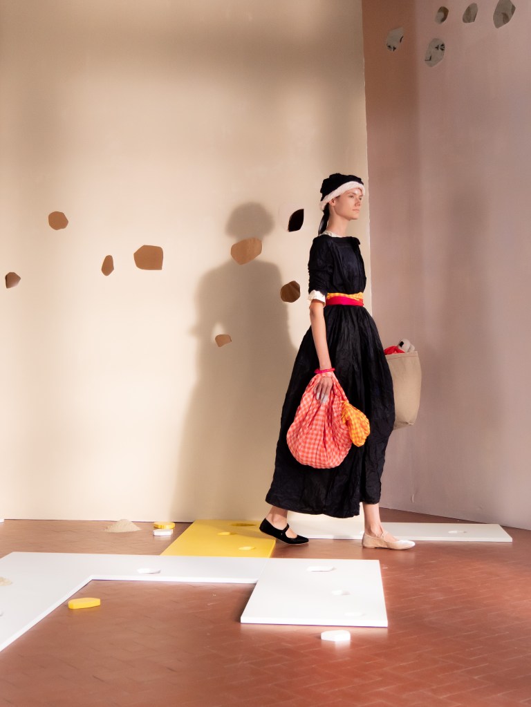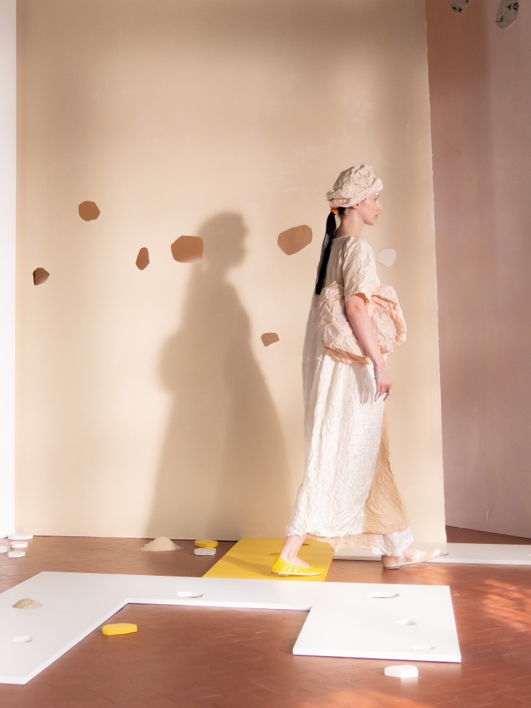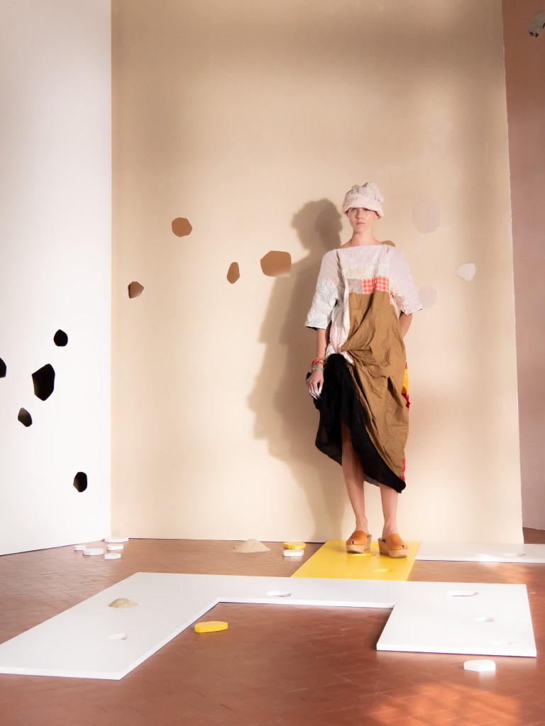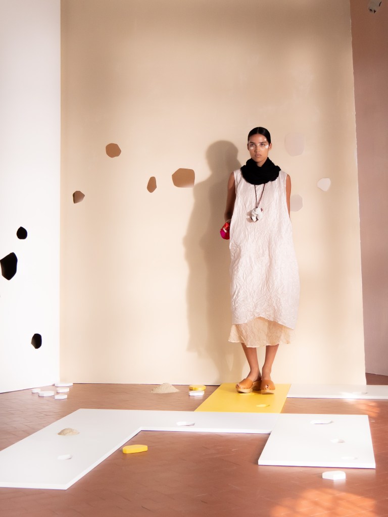 Light, color, joy “…ma perché rosa?” That is the title of Daniela Gregis SS26, and the whole show felt like stepping into her idea of sun and seaside. She brought this soft, warm atmosphere into Milan Fashion Week with a stage built in beige and white, full of irregular cut-outs that mimic rocks or cliffs by the shore. Right next to it was a huge window that let the light spill in. It was artificial this time because the weather was miserable, but honestly it still felt poetic in its own way. The runway itself wasn’t linear. It moved in little paths, almost like those wooden walkways you take toward the water. Because of that layout, I managed to capture some layered compositions of the final walk with several models crossing in different directions in the same frame. It looked beautiful in motion and even better frozen in a single shot.