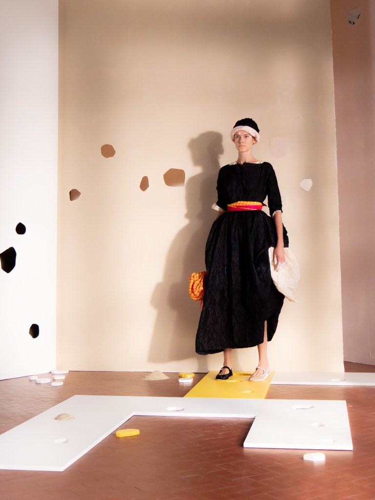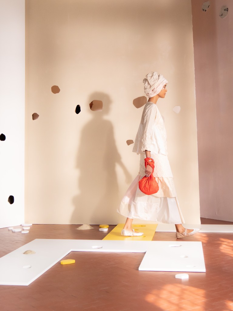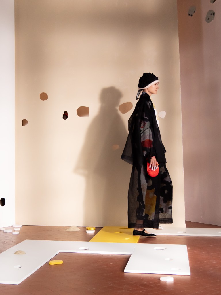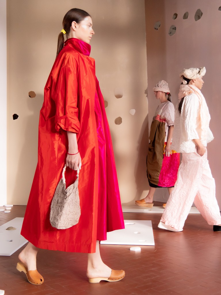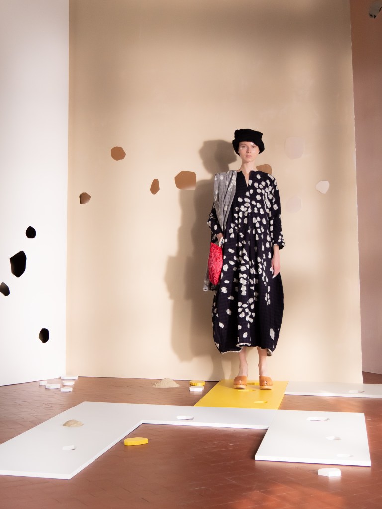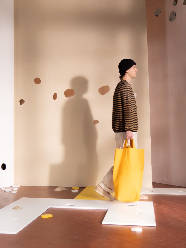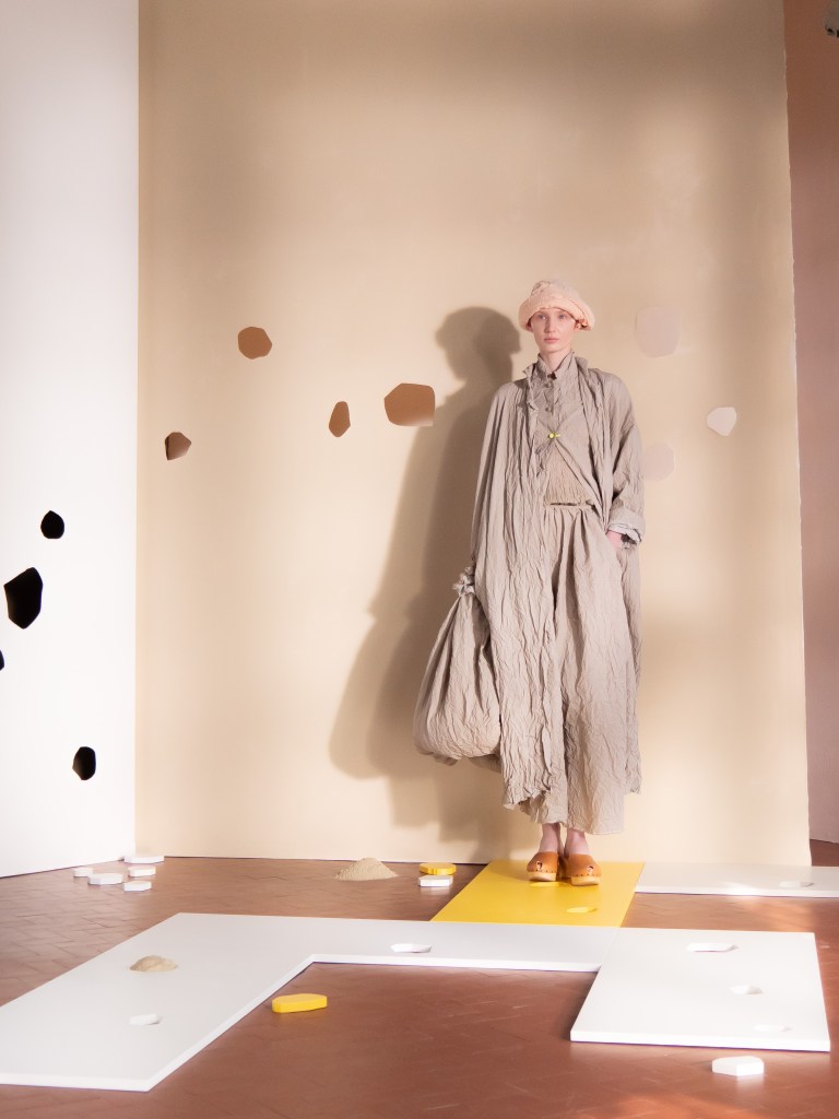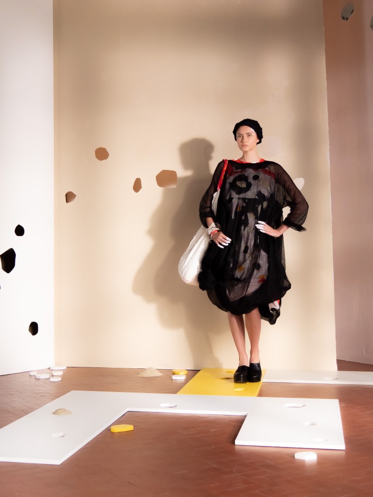 Light, color, joy “…ma perché rosa?” That is the title of Daniela Gregis SS26, and the whole show felt like stepping into her idea of sun and seaside. She brought this soft, warm atmosphere into Milan Fashion Week with a stage built in beige and white, full of irregular cut-outs that mimic rocks or cliffs by the shore. Right next to it was a huge window that let the light spill in. It was artificial this time because the weather was miserable, but honestly it still felt poetic in its own way. The runway itself wasn’t linear. It moved in little paths, almost like those wooden walkways you take toward the water. Because of that layout, I managed to capture some layered compositions of the final walk with several models crossing in different directions in the same frame. It looked beautiful in motion and even better frozen in a single shot.