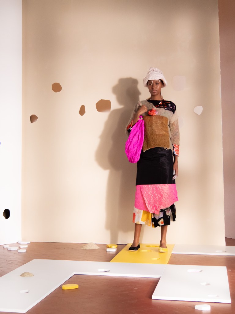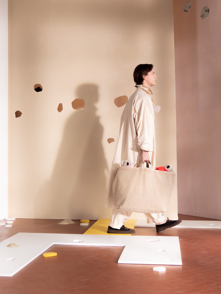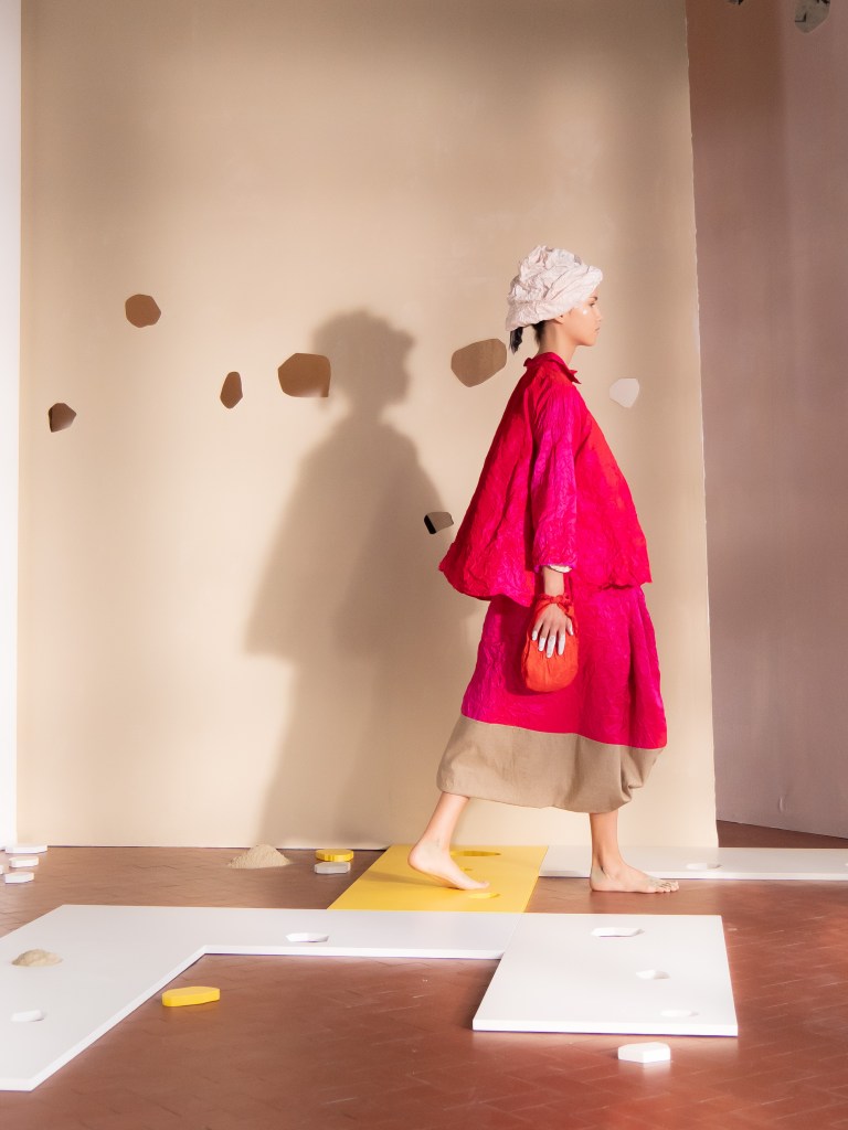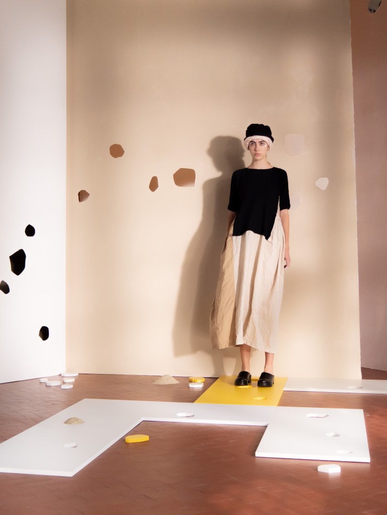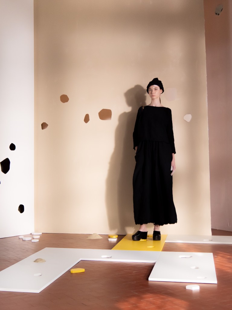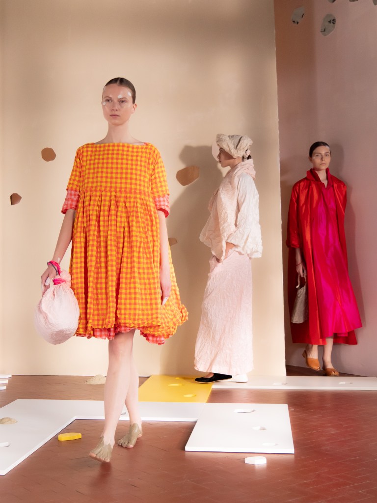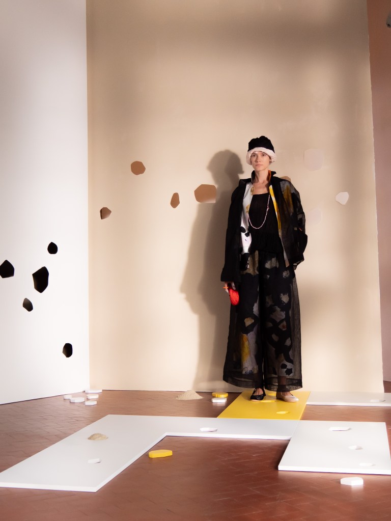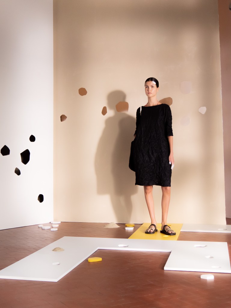 Light, color, joy “…ma perché rosa?” That is the title of Daniela Gregis SS26, and the whole show felt like stepping into her idea of sun and seaside. She brought this soft, warm atmosphere into Milan Fashion Week with a stage built in beige and white, full of irregular cut-outs that mimic rocks or cliffs by the shore. Right next to it was a huge window that let the light spill in. It was artificial this time because the weather was miserable, but honestly it still felt poetic in its own way. The runway itself wasn’t linear. It moved in little paths, almost like those wooden walkways you take toward the water. Because of that layout, I managed to capture some layered compositions of the final walk with several models crossing in different directions in the same frame. It looked beautiful in motion and even better frozen in a single shot.
