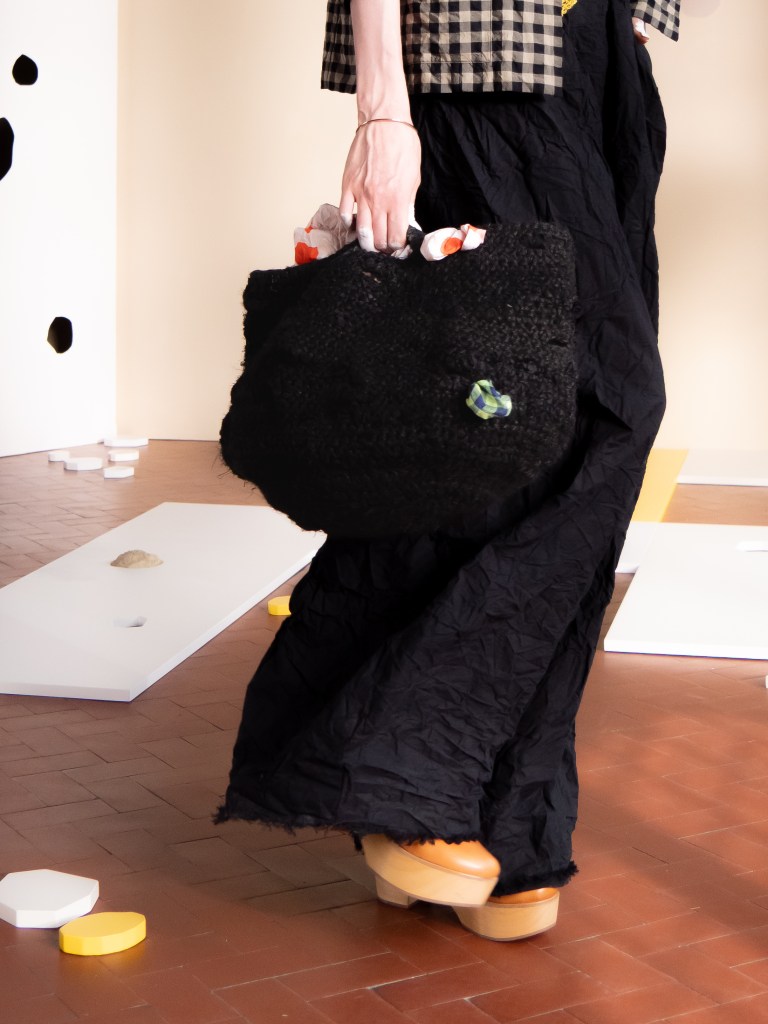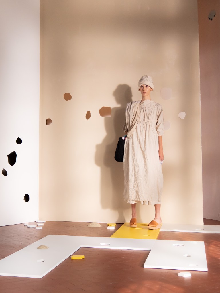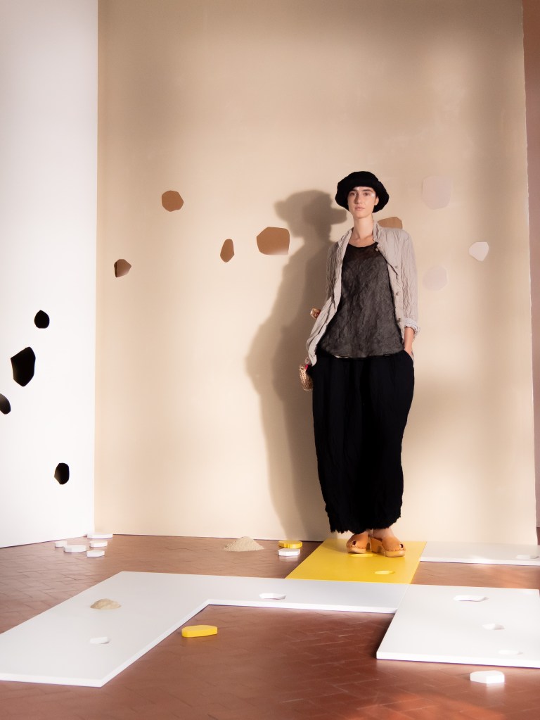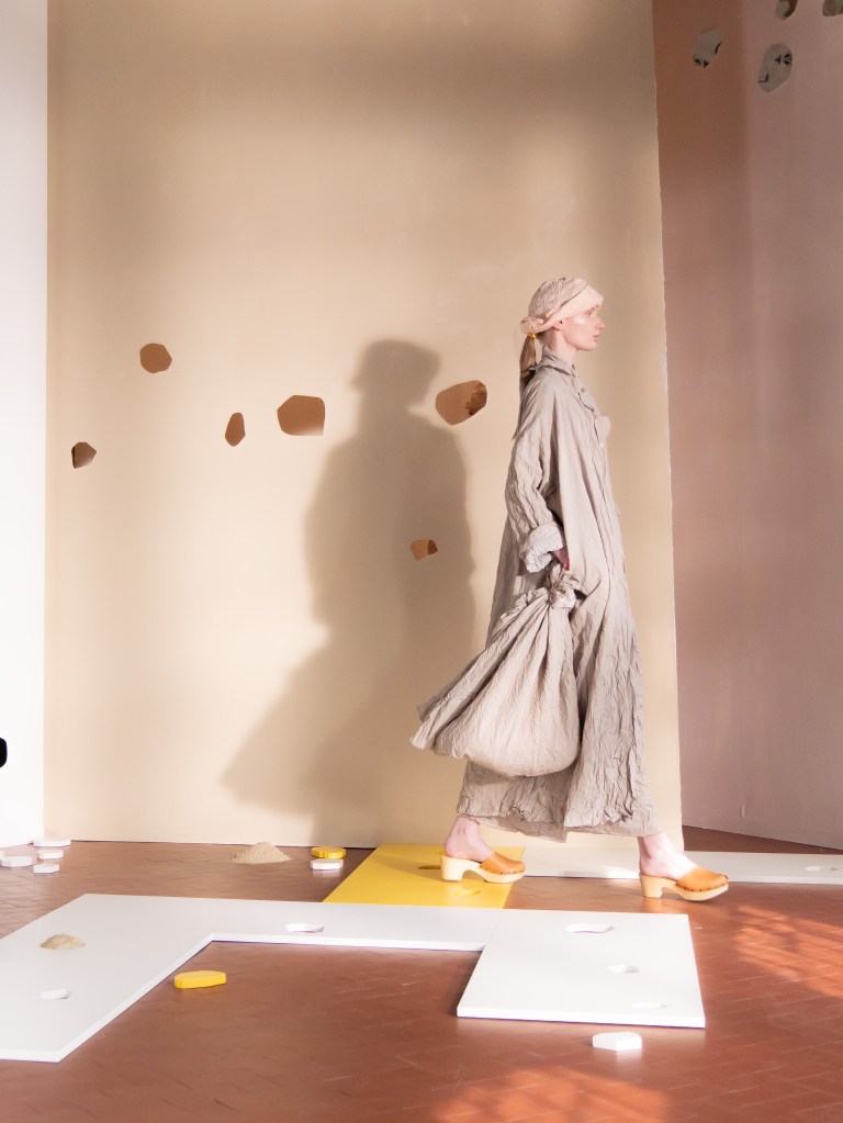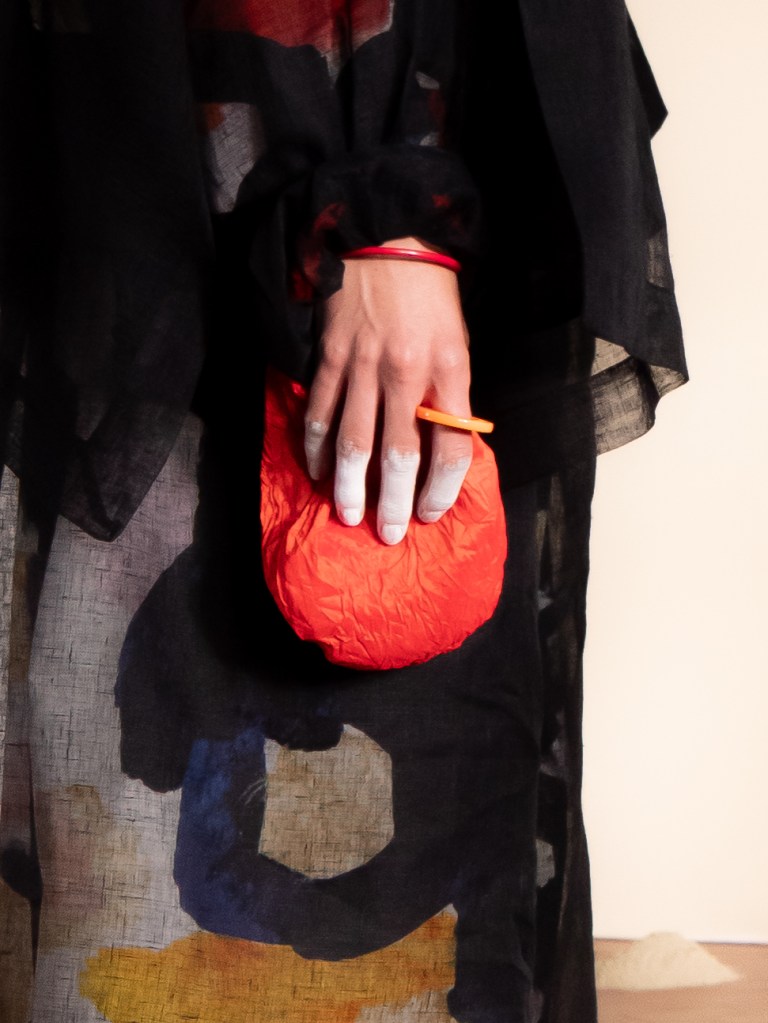 The show felt minimal, yet I ended up capturing so many beautiful and poetic moments on the runway. The models were styled like people who live close to the sea, and there were hints of a fishing village vibe in the design and styling. I know that sounds questionable, but it worked in a very Daniela Gregis way. There were so many small details that you could easily miss if you blink too fast: white painted fingers, bare feet brushed with what looked like sand, mismatched shoes, worn out crochet bags and ponytails painted white. These are just a few of the details I noticed. Did you spot anything else that I might have missed?